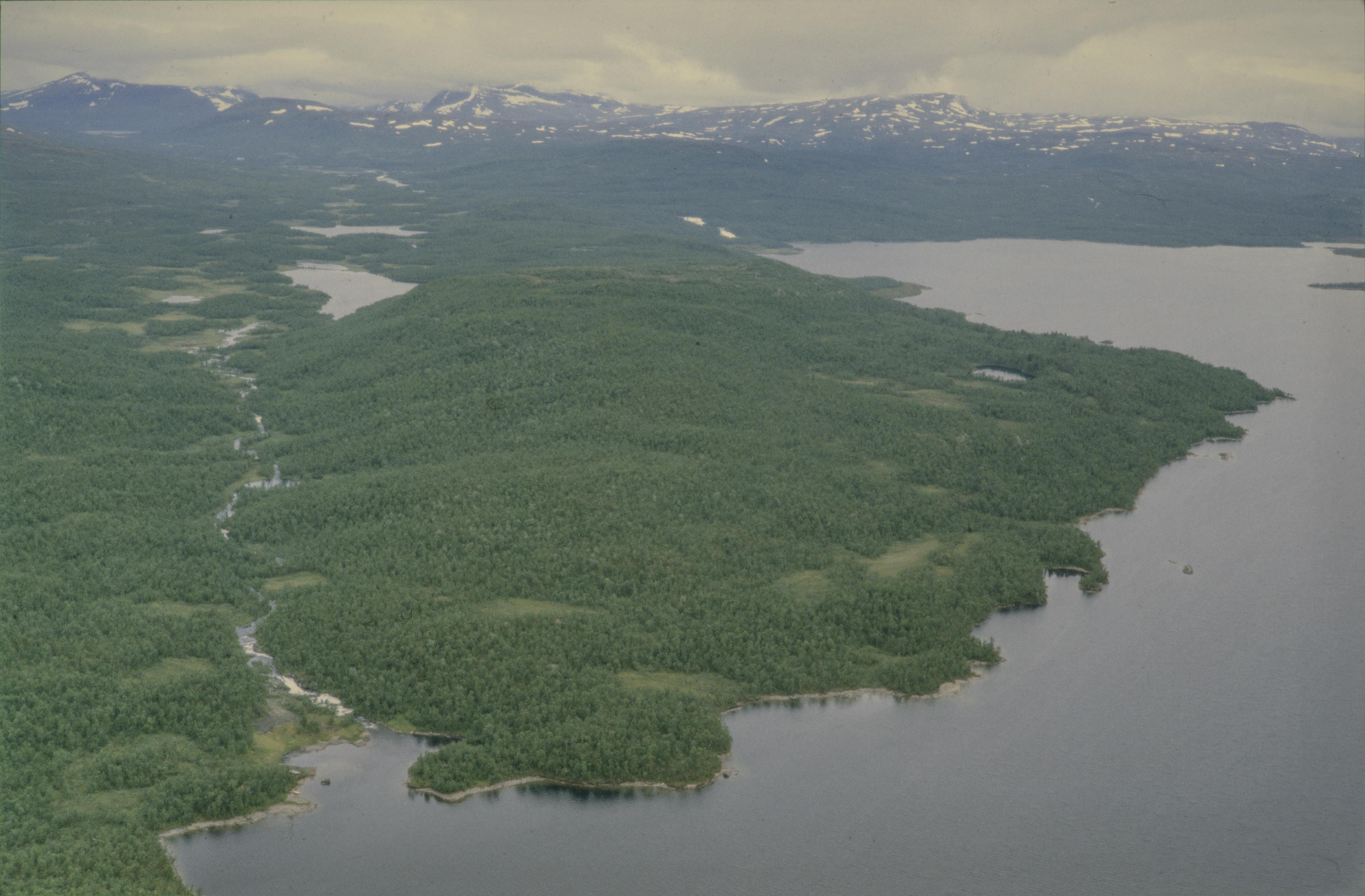 Beskrivning: Dalgången vid Silbojokks silverhytta i nordvästra ändan av sjön Sädvajaure (Sädvvájávrre). Nere till vänster utloppet av ån Silbojokk (Silbbajåhkå). Vid utloppet hyttlämningar efter Nasafjälls silververk RAÄnr Arjeplog 368:1, boplats Arjeplog 296:1 och begravningsplats Arjeplog 4232. Bilden är tagen mot (väderstreck): NV