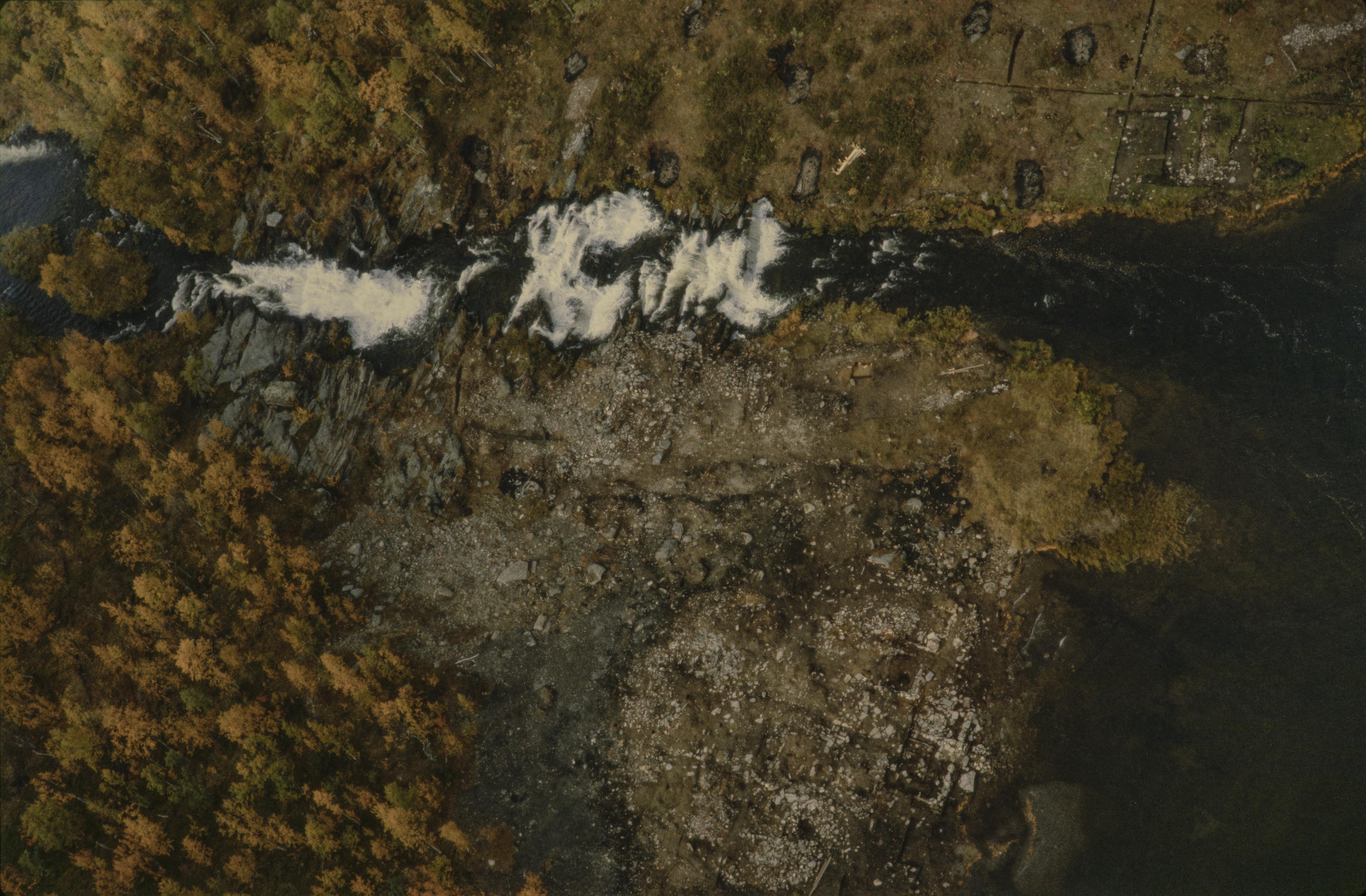 Beskrivning: qq <BILDEN SKA VÄNDAS> Silbojokks silverhytta i nordvästra ändan av sjön Sädvajaure (Sädvvájávrre). Utloppet av ån Silbojokk (Silbbajåhkå). Vid utloppet hyttlämningar efter Nasafjälls silververk RAÄnr Arjeplog 368:1, boplats Arjeplog 296:1 och begravningsplats Arjeplog 4232. Bilden är tagen mot (väderstreck): NV