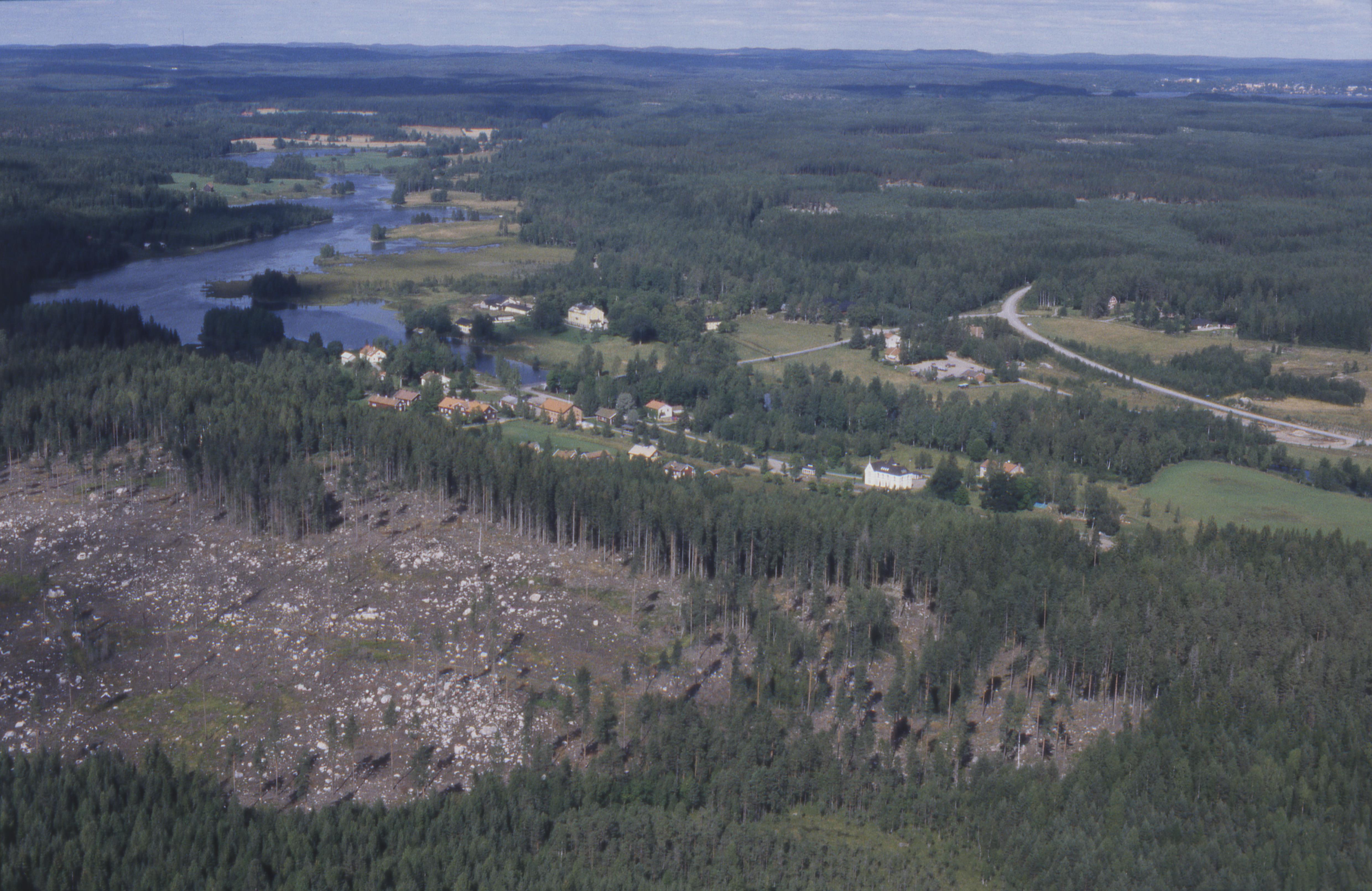 Beskrivning: Uttersbergs bruk i Hedströmmens dalgång. Hedströmmen markerar gränsen mellan socknen Hed (till vänster) och Skinnskatteberg (till höger). Vid bildens mitt hytt- och hammarområde RAÄnr Hed 15:1 och Skinnskatteberg 10:1. Bilden är tagen mot (väderstreck): N