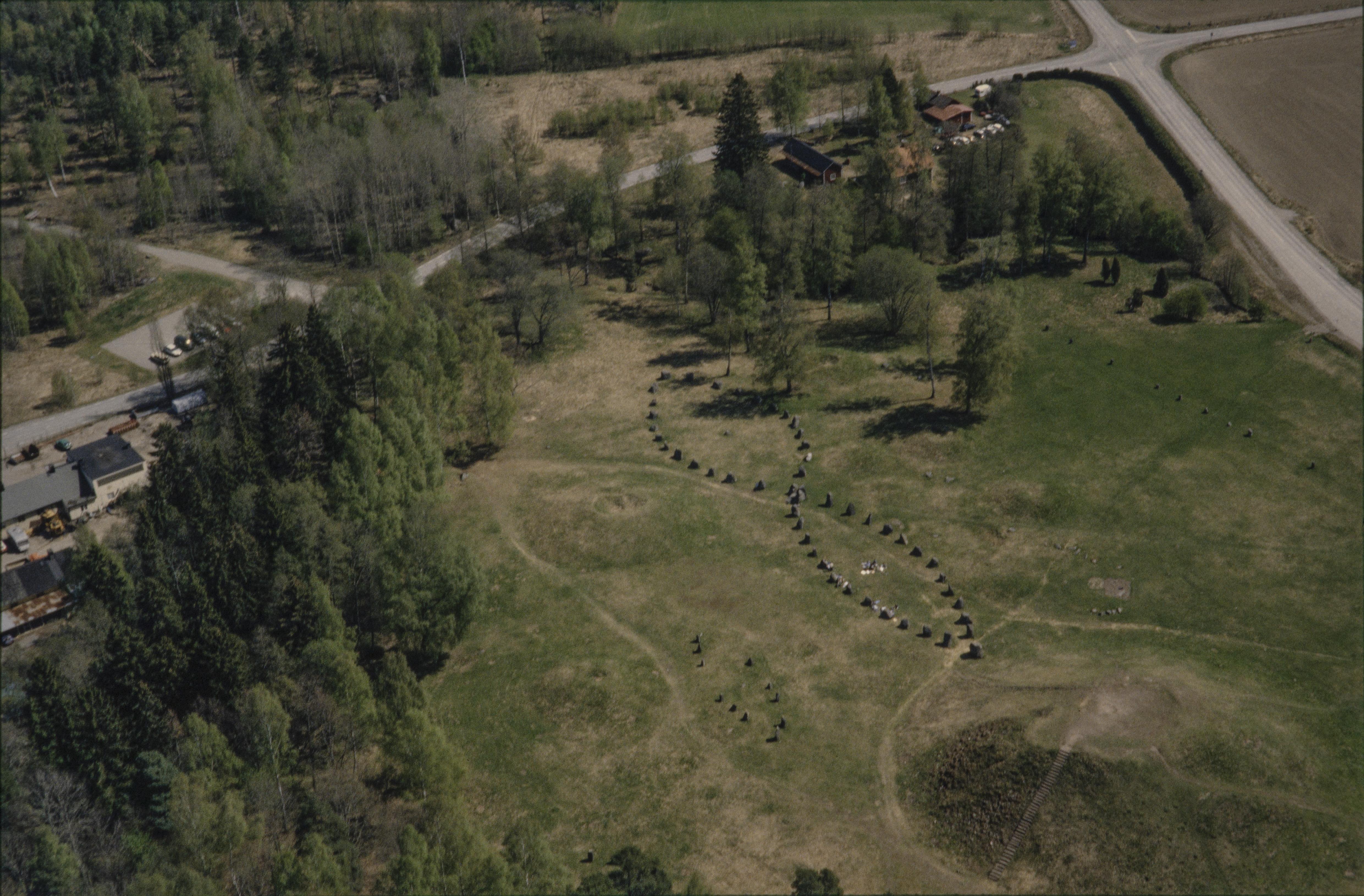 Beskrivning: Fornlämningsområdet Anundshög RAÄnr Västerås 431:1 vid Badelundaåsen i Badelunda. I området finns storhög, skeppssättningar, väglämningar och runsten m.m. Bilden är tagen mot (väderstreck): Ö