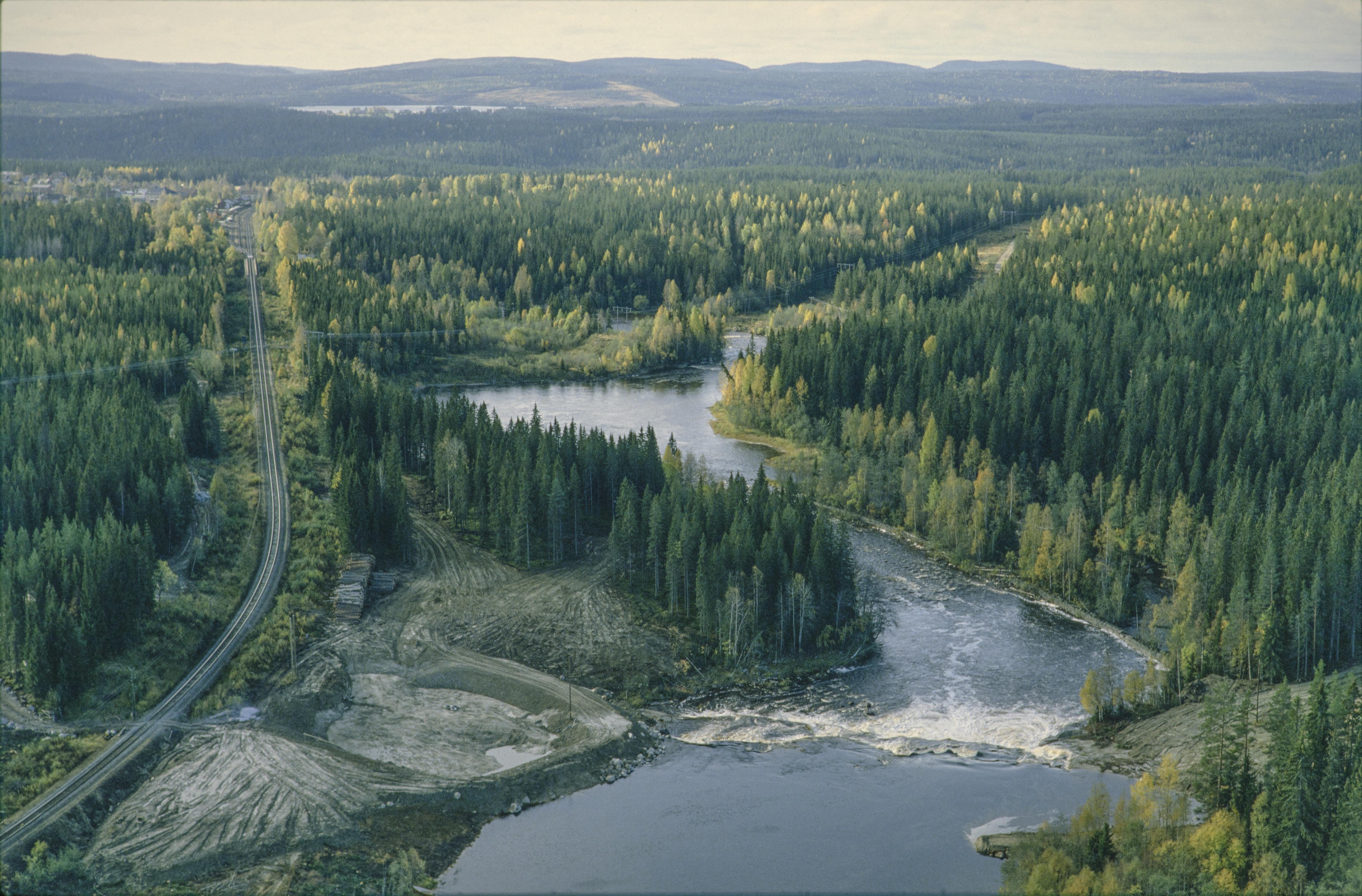 Beskrivning: Gideälvens dalgång norr om Björna tätort. I skogen till vänster om bildens mitt järnvägsspår i skogen vid byggplatsen för Björna kraftverk. Nere till höger Björnafallet. Över bildens mitt Björnafallsaggan och Svartsvedjeforsen. Bilden är tagen mot (väderstreck): SSV