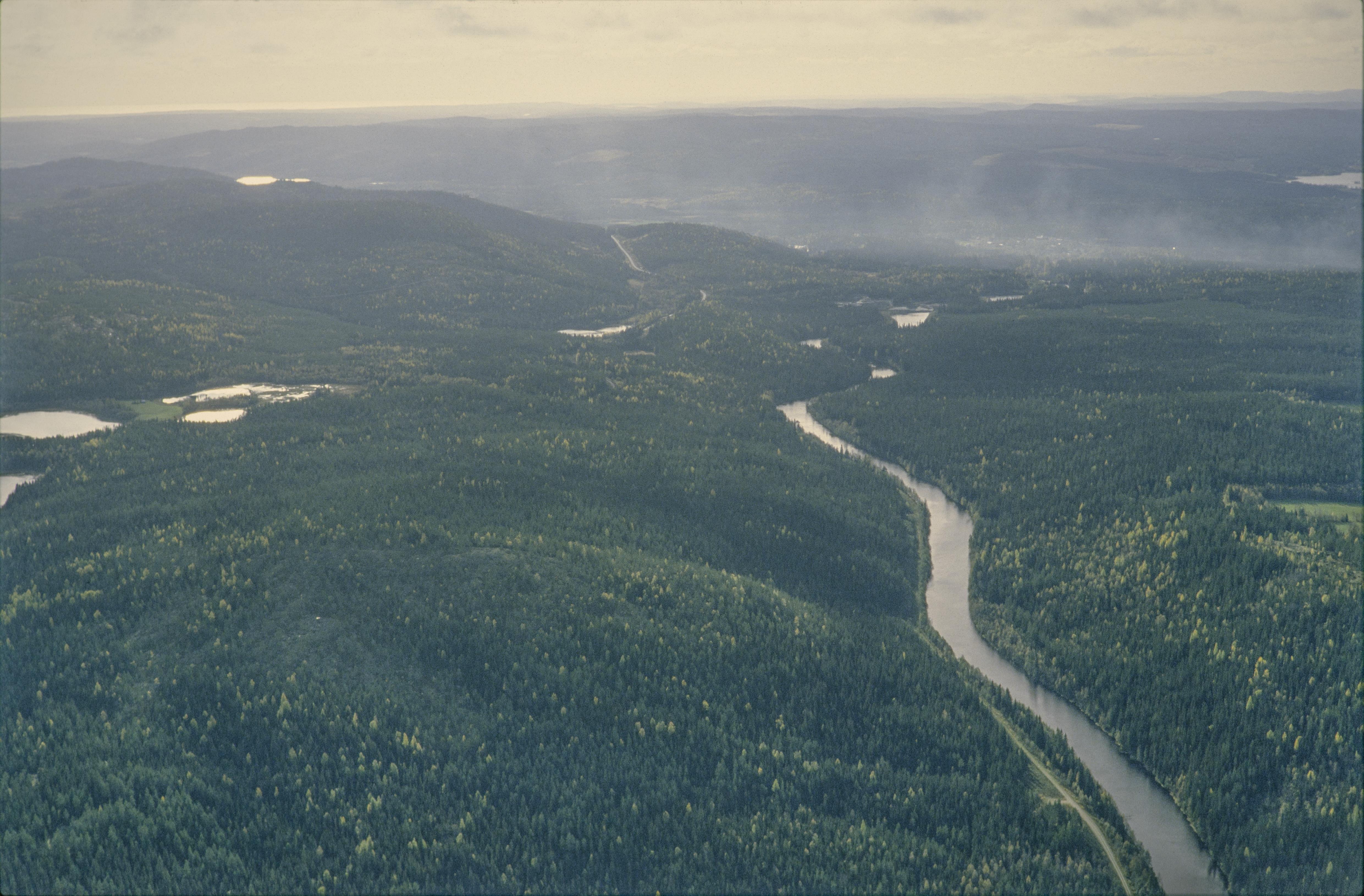 Beskrivning: Gideälvens dalgång mot Björna tätort. Vid bildens mitt byggplats för Björna kraftverk vid Björnafallet. Björna tätort med fångstgrop RAÄnr Björna 191:1 uppe till höger. Bilden är tagen mot (väderstreck): S