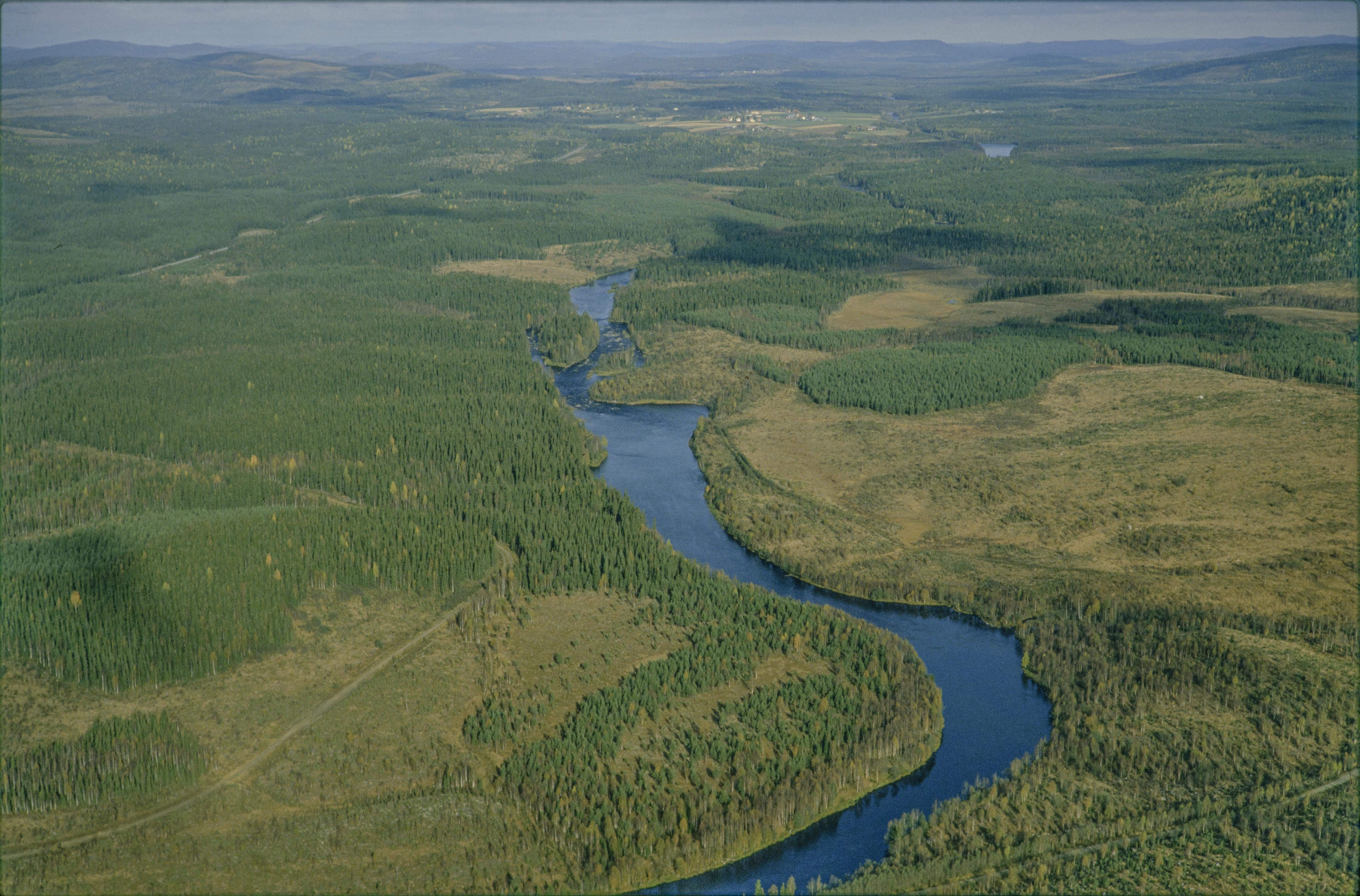 Beskrivning: Gideälvens dalgång väster om Mattarbodberget. Över bildens mitt Oxholmen i Mattarbodforsen söder om skogbrukslämning (rotvältor) RAÄnr Björna 276:1. Området Gåsmyran uppe till höger. Bilden är tagen mot (väderstreck): NNV