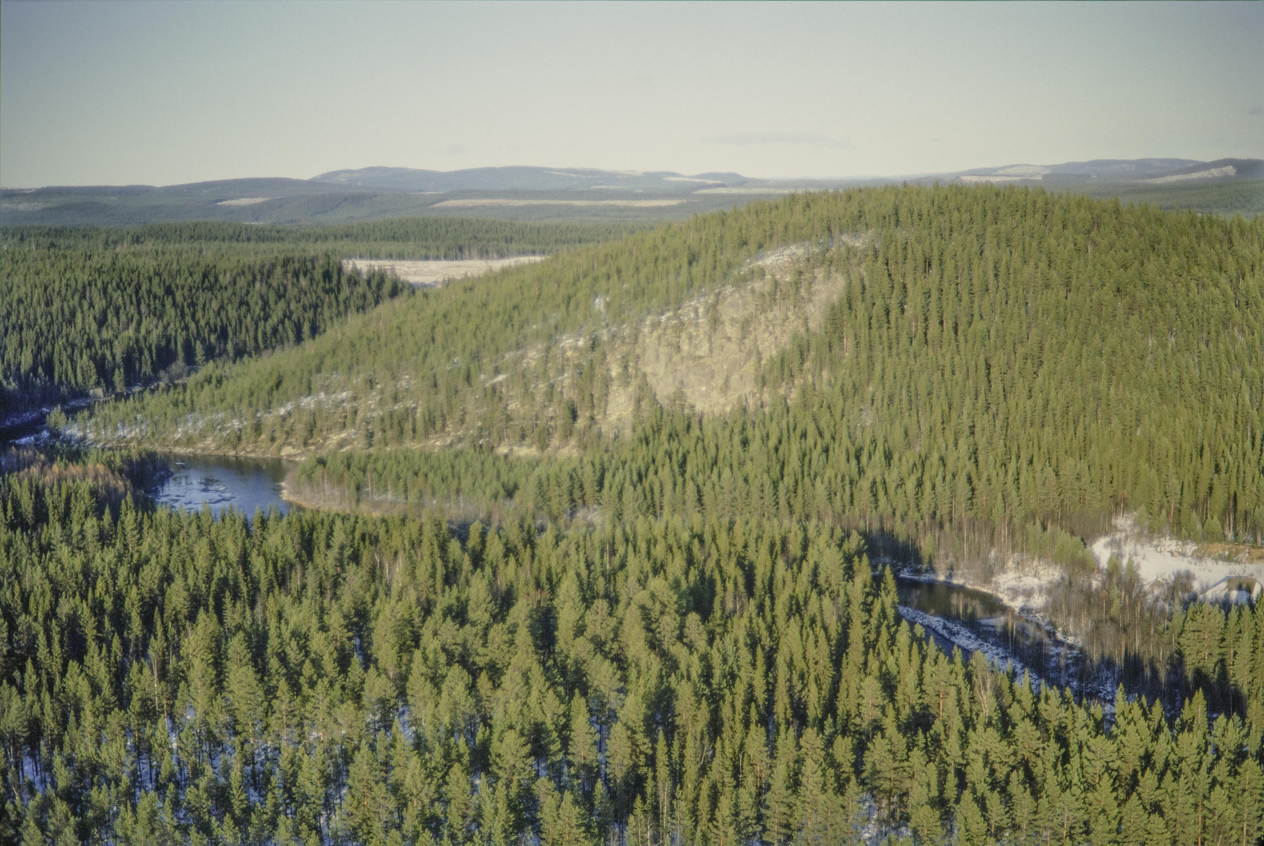 Beskrivning: Brattforsberget vid Storån, Malmån och Vängelälven. I bergsidan vid bildens mitt hällmålningar RAÄnr Fjällsjö 191:1. Bilden är tagen mot (väderstreck): NNO