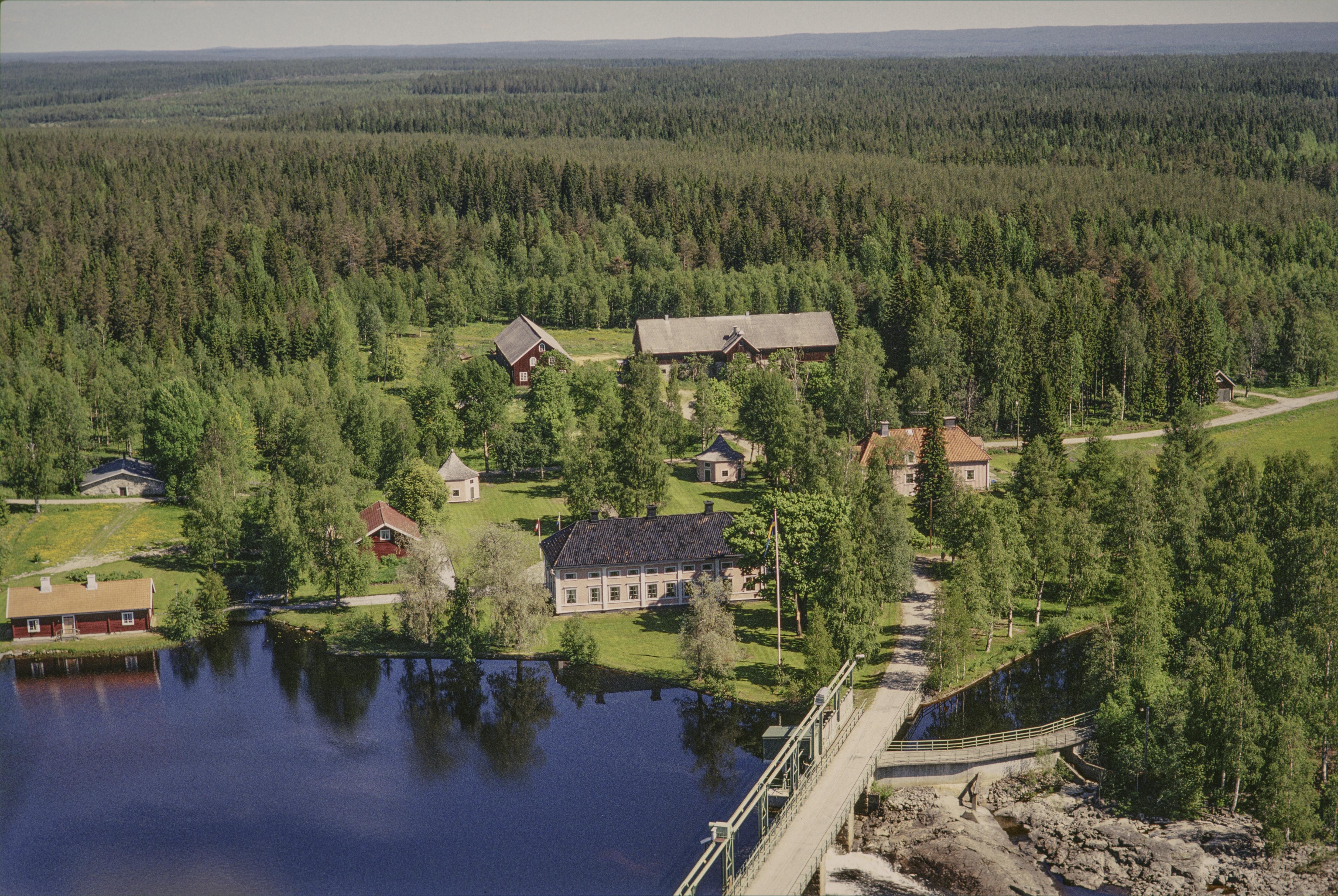 Beskrivning: Gideåbruk (skrivs även Gideå bruk) i Gideälven. Område med järnbrukslämningar RAÄnr Gideå 5:1. Vid bildens mitt Gideåbruks herrgård. Bilden är tagen mot (väderstreck): NNO