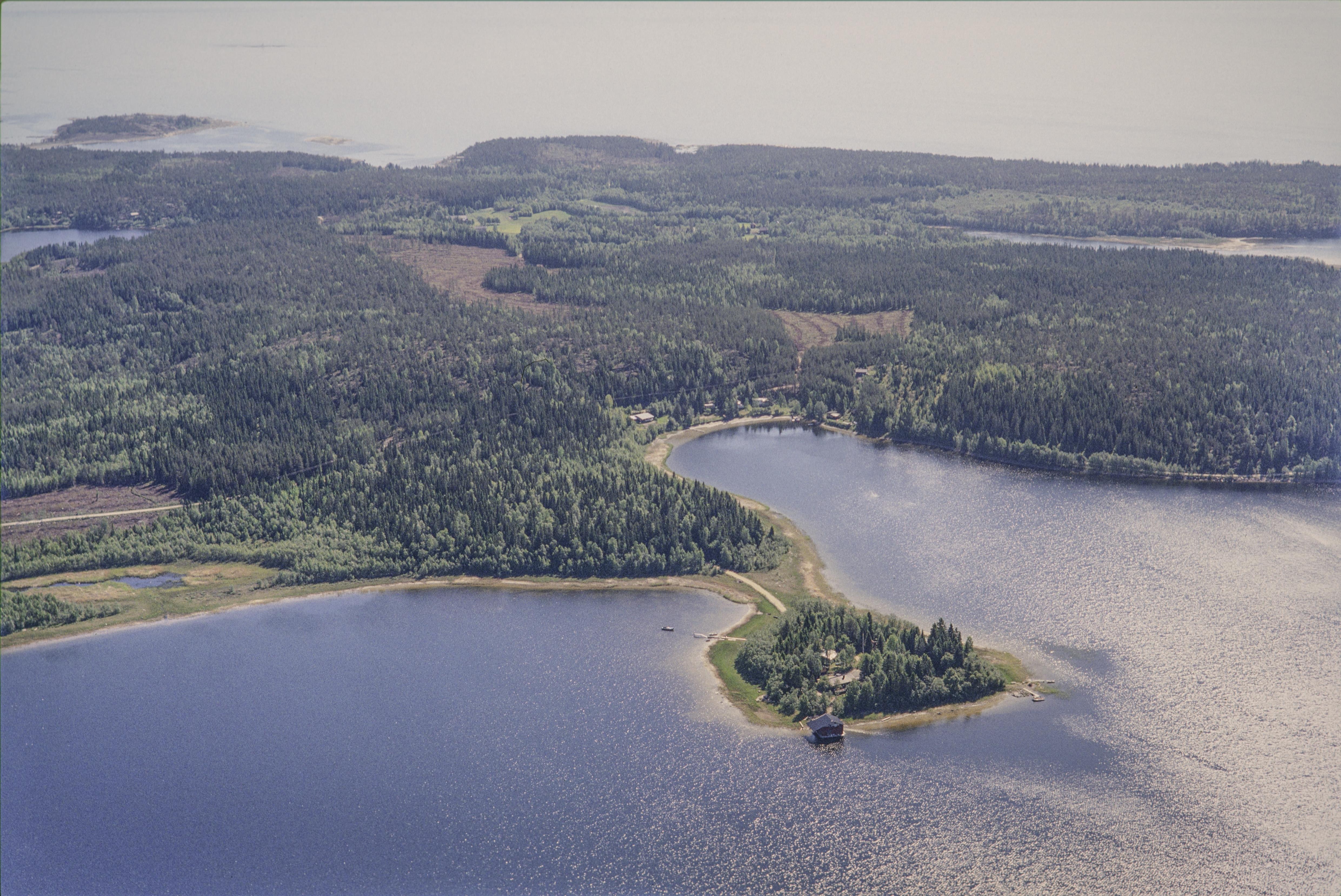 Beskrivning: I bildens nedre del udden Skallörsharen mellan Skallörsfjärden (nere till vänster) och Kyrkviken (till höger). Vid Tvärlandsberget över bildens mitt bytomt med lämningar efter byggnader och kyrka/kapell RAÄnr Grundsunda 121:1-2 vid en stenugn Grundsunda 218:1. Bilden är tagen mot (väderstreck): SO