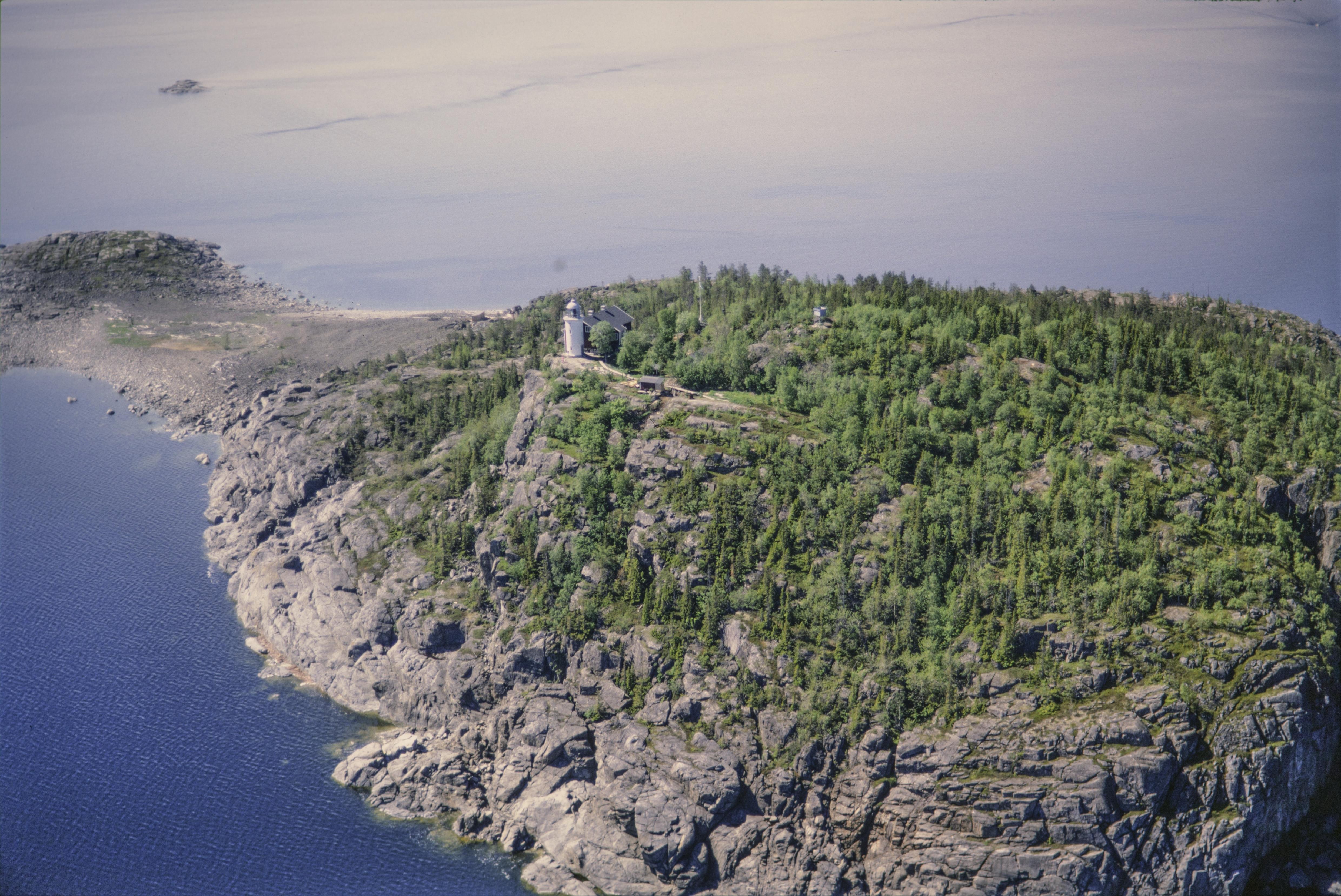 Beskrivning: Världsarvsområdet Höga kusten. Ön Högbonden i Högbondens naturreservat. Högbondens fyrplats till vänster över bildens mitt. Bilden är tagen mot (väderstreck): SV