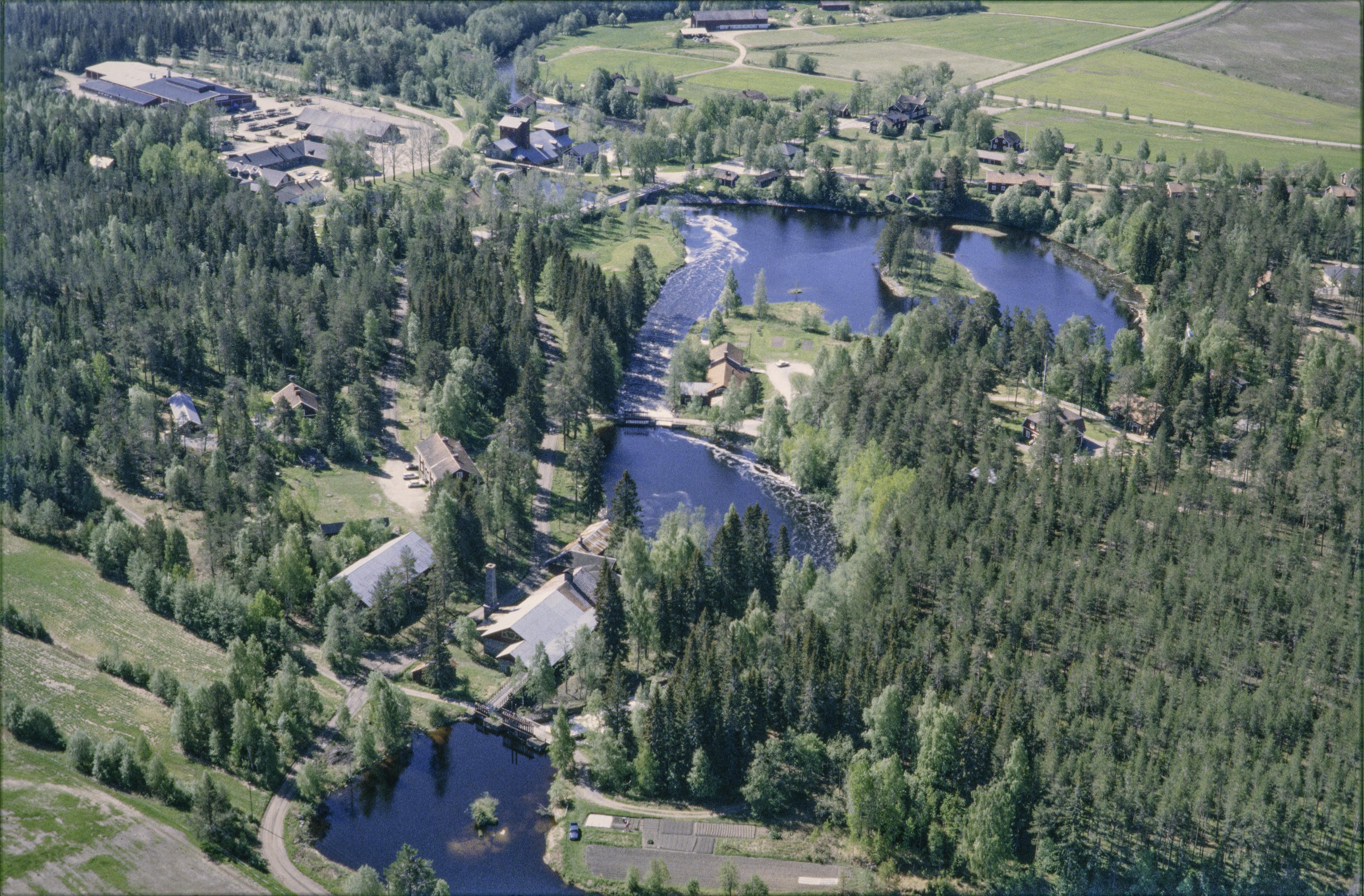 Beskrivning: Olofsfors järnbruk (Olofsfors bruk) vid Leduån. Lustholmen i vattnet till höger över bildens mitt. Bilden är tagen mot (väderstreck): SSV