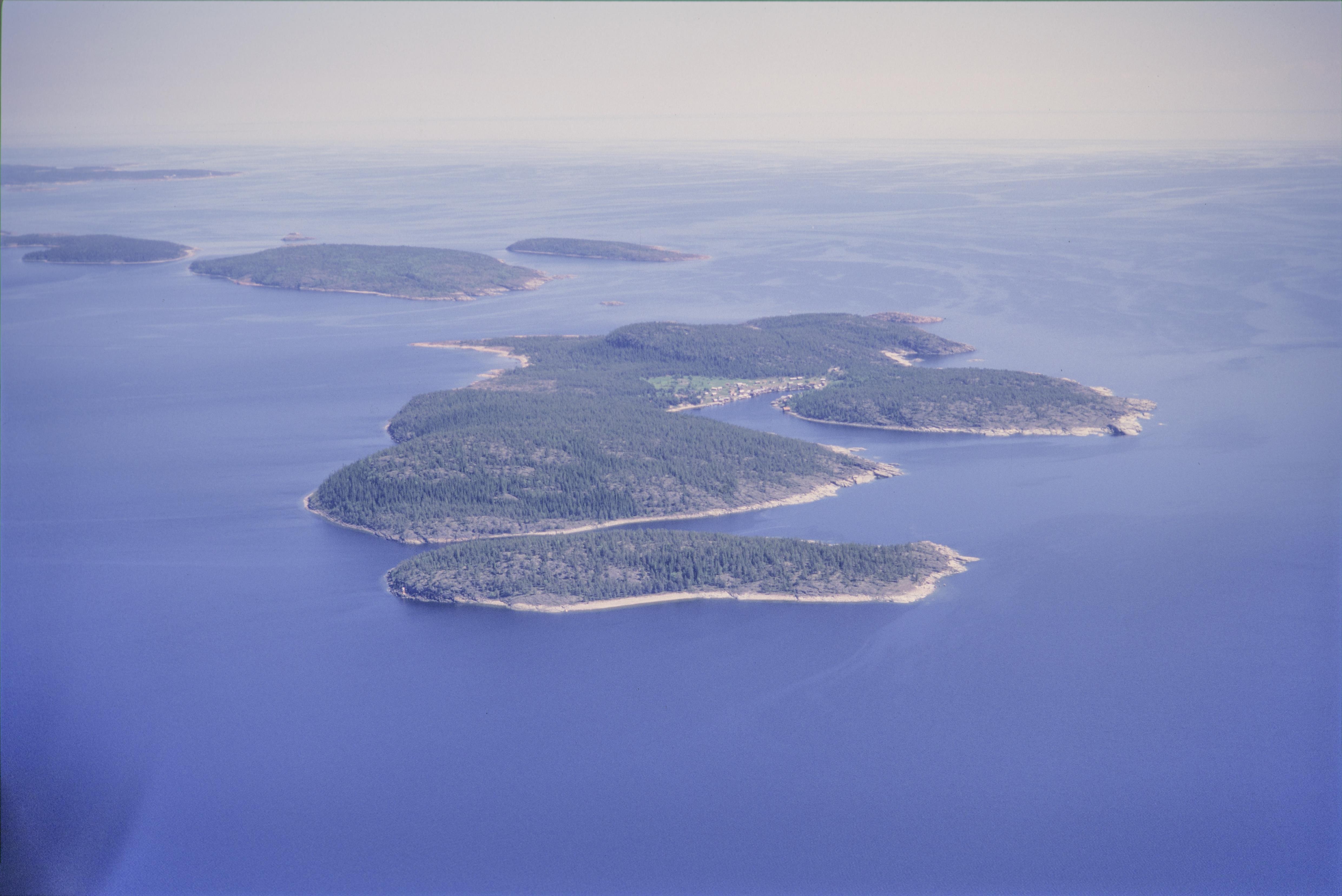 Beskrivning: Höga kustens världsarvsområde. Öar i naturreservatet Trysunda öster om Nätrafjärden. Trysundaholmen (under bildens mitt) vid huvudön Trysunda (i bildens mitt). Uppe till vänster fartygslämning RAÄnr Nätra 373 vid öarna Klösan och Ällön. I bildens mitt Trysunda fiskeläge med kapell på ön Trysunda. Bilden är tagen mot (väderstreck): Ö