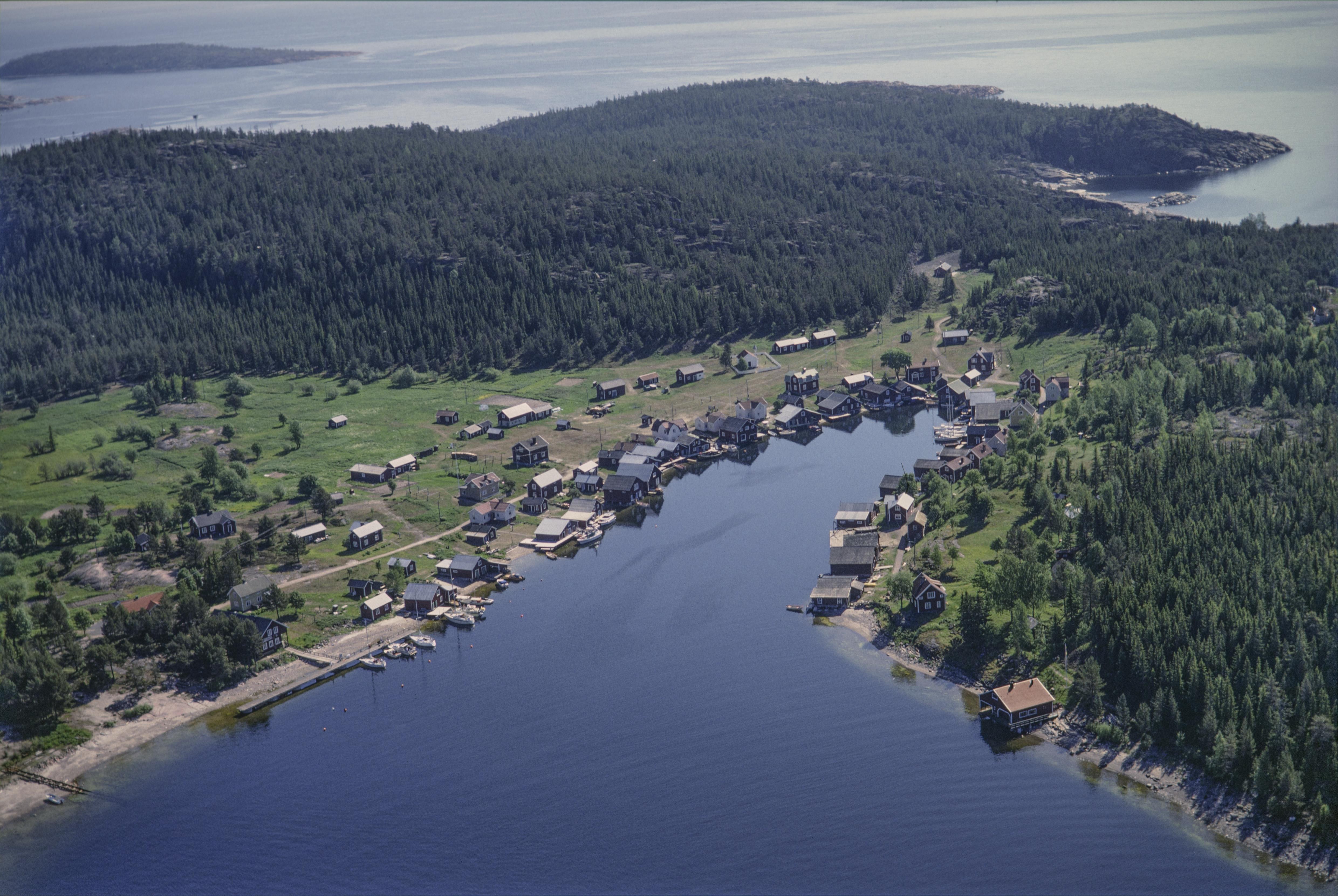 Beskrivning: Höga kustens världsarvsområde. Ön Trysunda i naturreservat öster om Nätrafjärden. I bildens mitt Trysunda fiskeläge med Trysunda kapell. Bilden är tagen mot (väderstreck): Ö