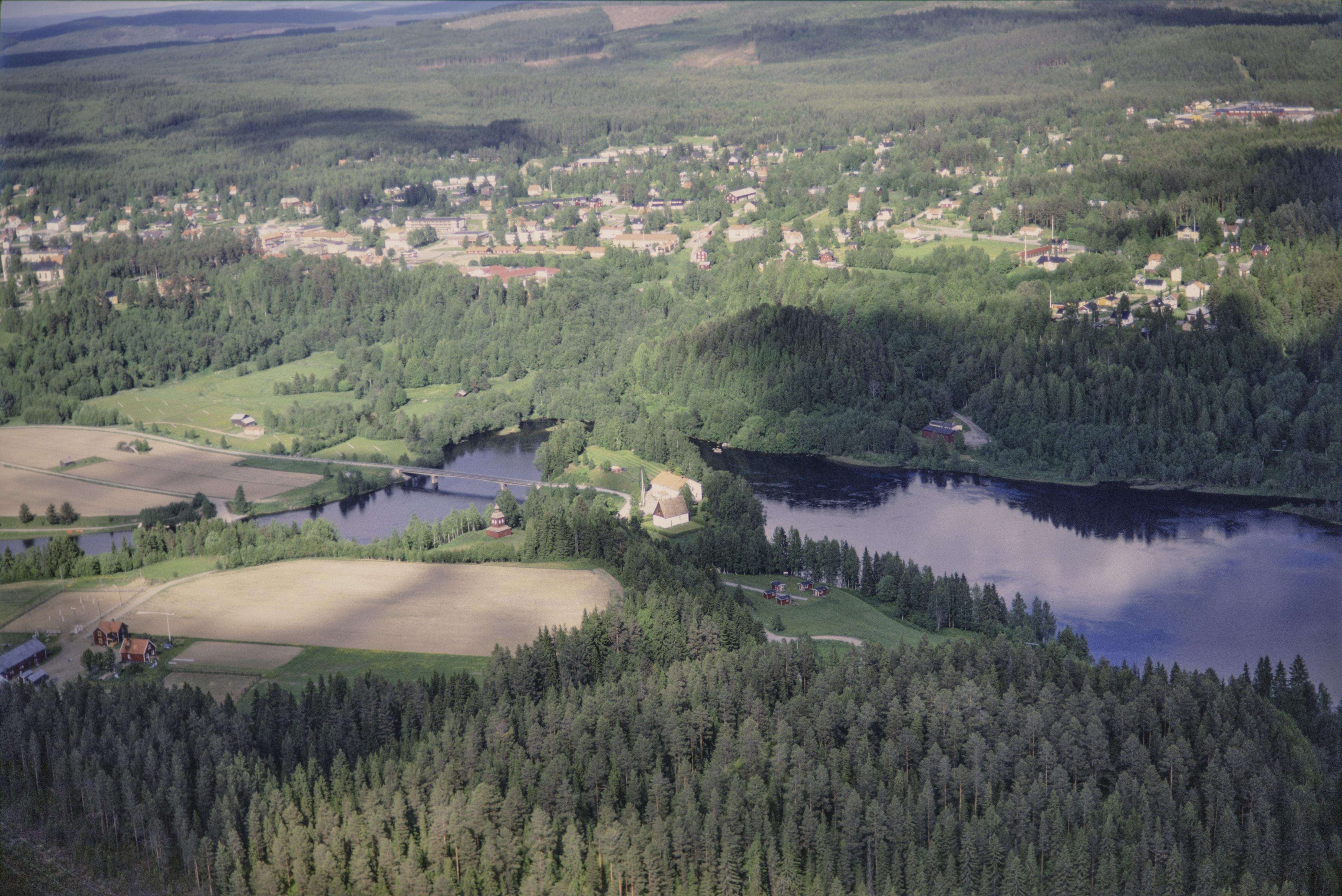 Beskrivning: Ramsele tätort och kyrkby i Faxälvens dalgång. Ramsele gamla kyrka vid bildens mitt. Vid vägen uppe till höger vägmärke RAÄnr Ramsele 70:1. Bilden är tagen mot (väderstreck): ONO