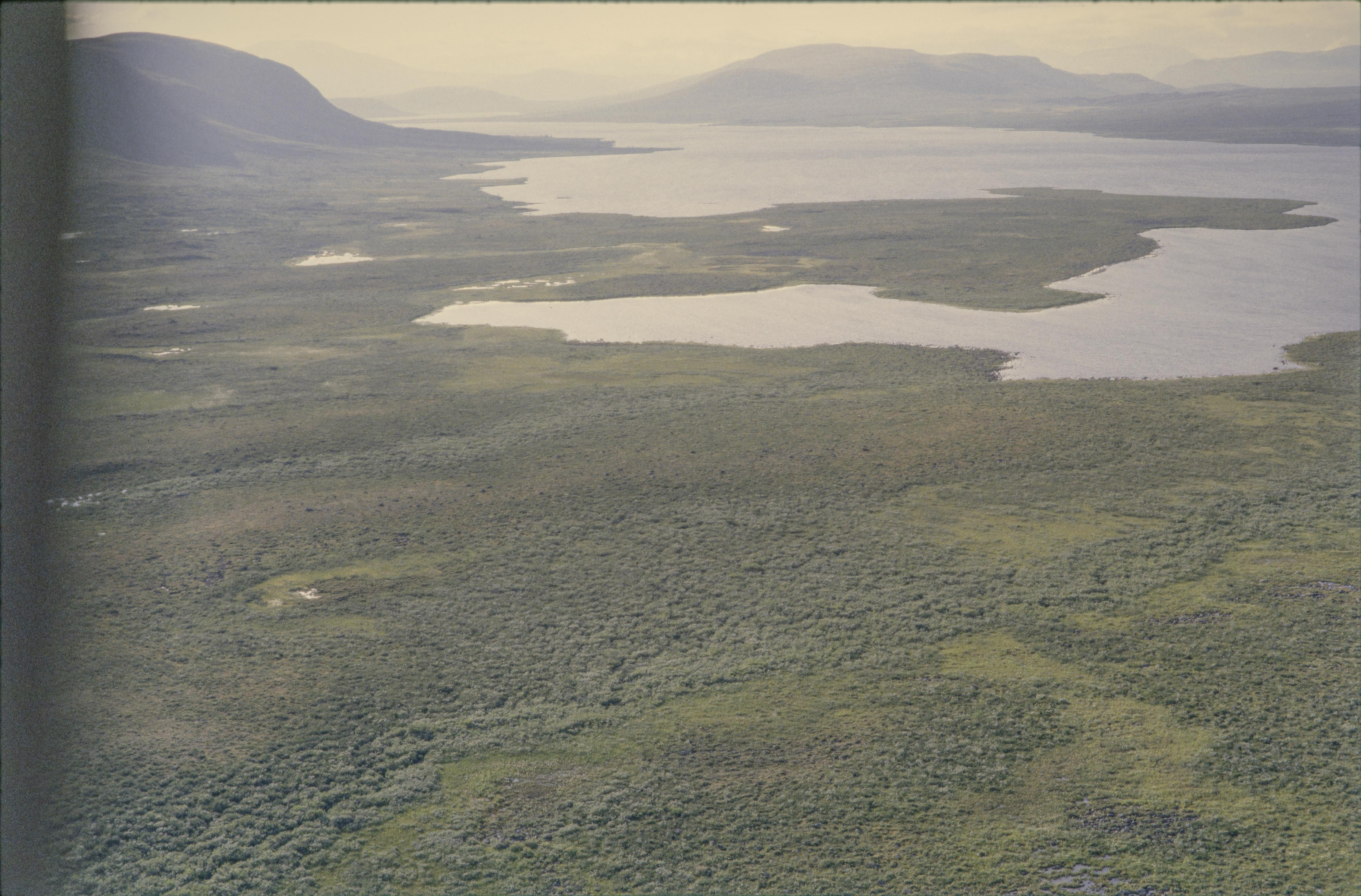 Beskrivning: Sjön Kiepanjaure (Giehpanjávri / Kiehpanjärvi), sydöstra stranden vid området Giehpangielas och stora udden. I bildens övre del fjällen Stuor Tuoipai och Duoibal längs sjöns nordvästra strand. Bilden är tagen mot (väderstreck): VNV