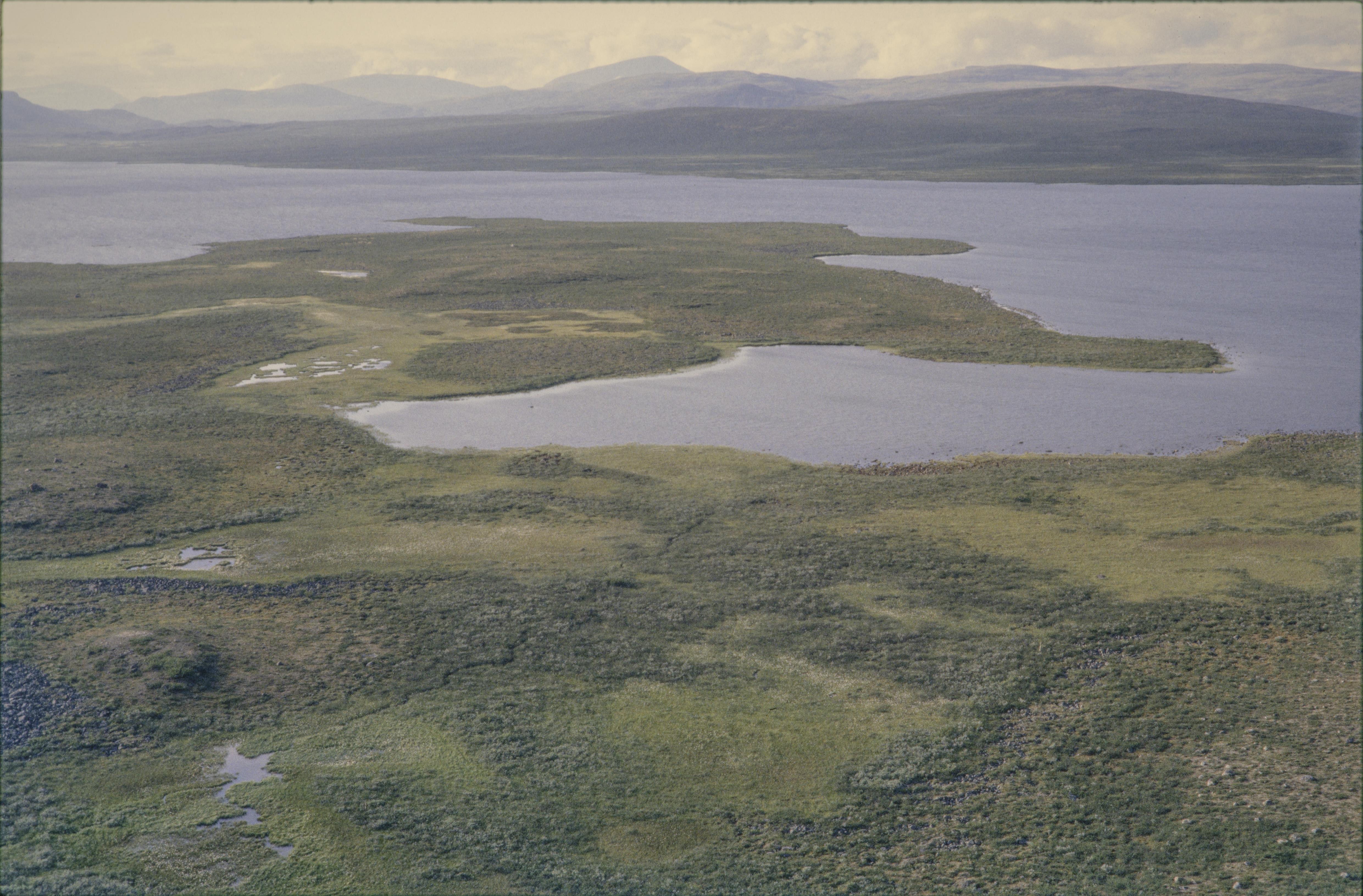 Beskrivning: Sjön Kiepanjaure (Giehpanjávri / Kiehpanjärvi), sydöstra stranden vid området Giehpangielas och stora udden. I bildens övre del fjällen Stuor Tuoipai och Duoibal längs sjöns nordvästra strand. Bilden är tagen mot (väderstreck): NV