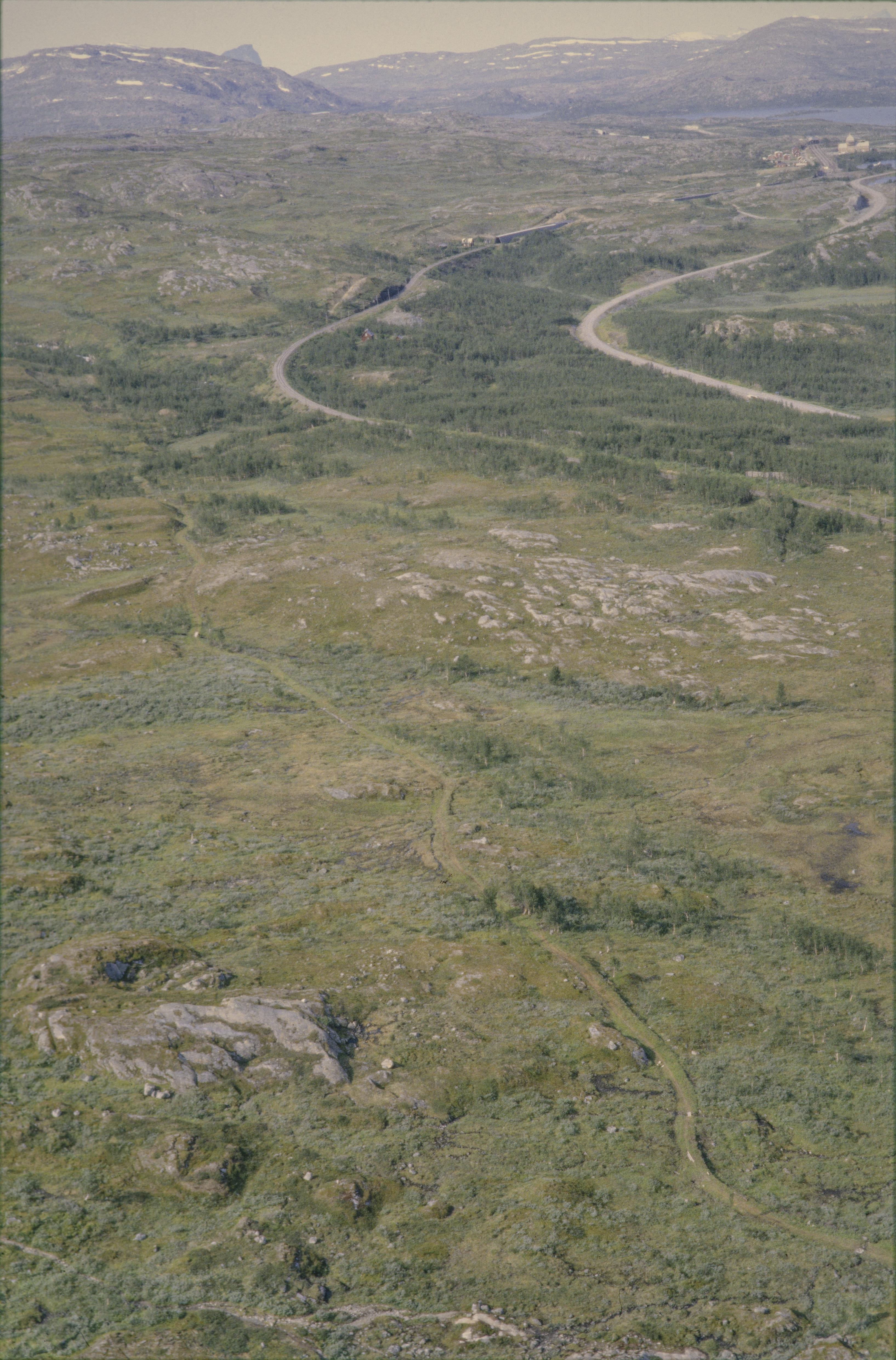 Beskrivning: Området öster om Vassijaure (Vássijávri). Uppe till höger Vassijaure järnvägsstation vid järnvägen Ofotbanen (Ofotbanan / Malmbanan). I bildens mitt och nedre del färdvägen "Materialvägen" RAÄnr Jukkasjärvi 2701 och 2702. Bilden är tagen mot (väderstreck): V
