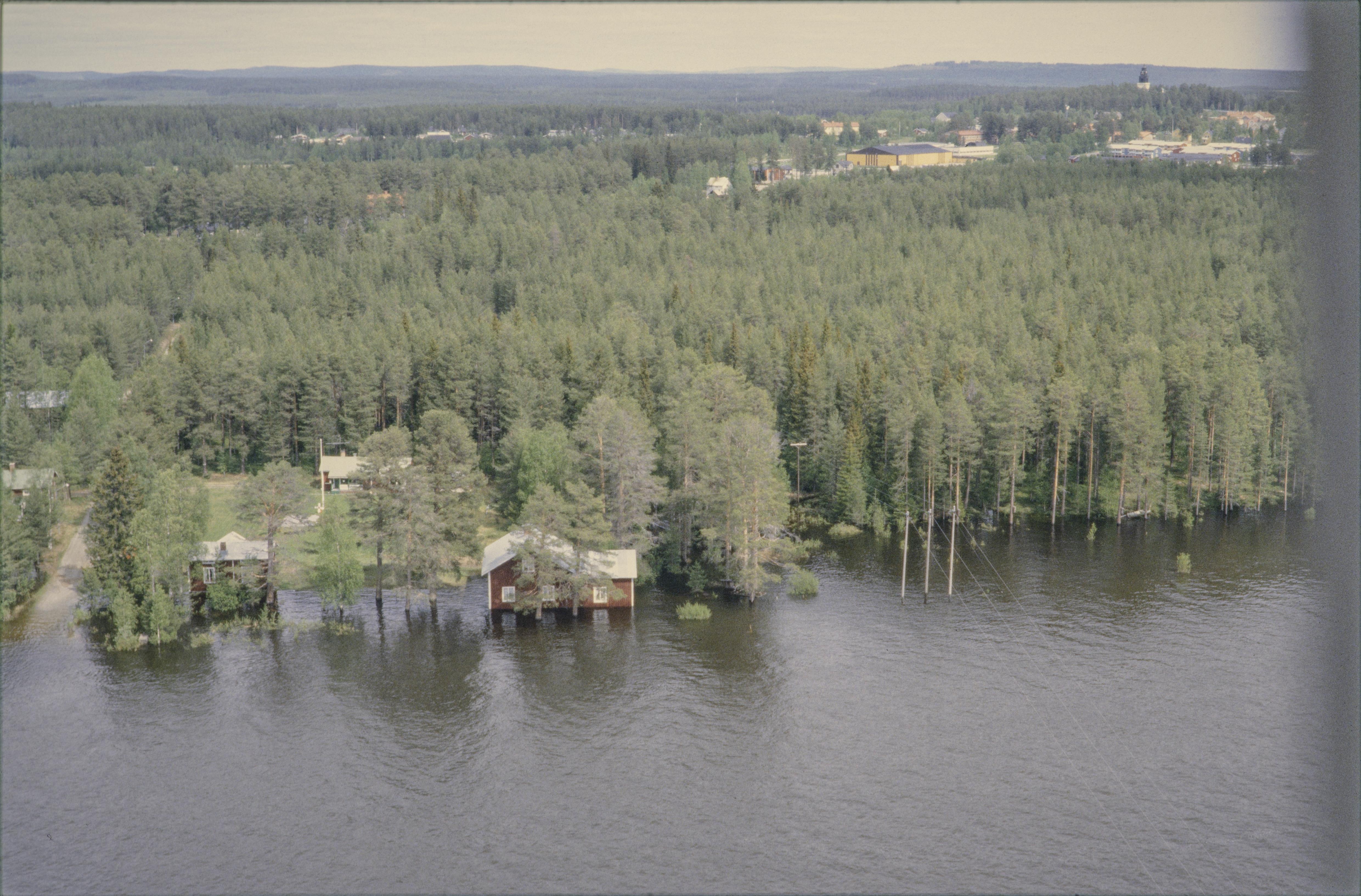 Beskrivning: Ångermanälven (sträcken Åseleälven) vid Åsele kyrkby. Åsele kyrka uppe till höger. Vid bildens mitt området Sjeltie delvis översvämmat efter vårfloden. Sörstrandsvägen längs bildens vänstra kant. Fångstgropssystem RAÄnr Åsele 7:1 i skogen till höger. Bilden är tagen mot (väderstreck): NO