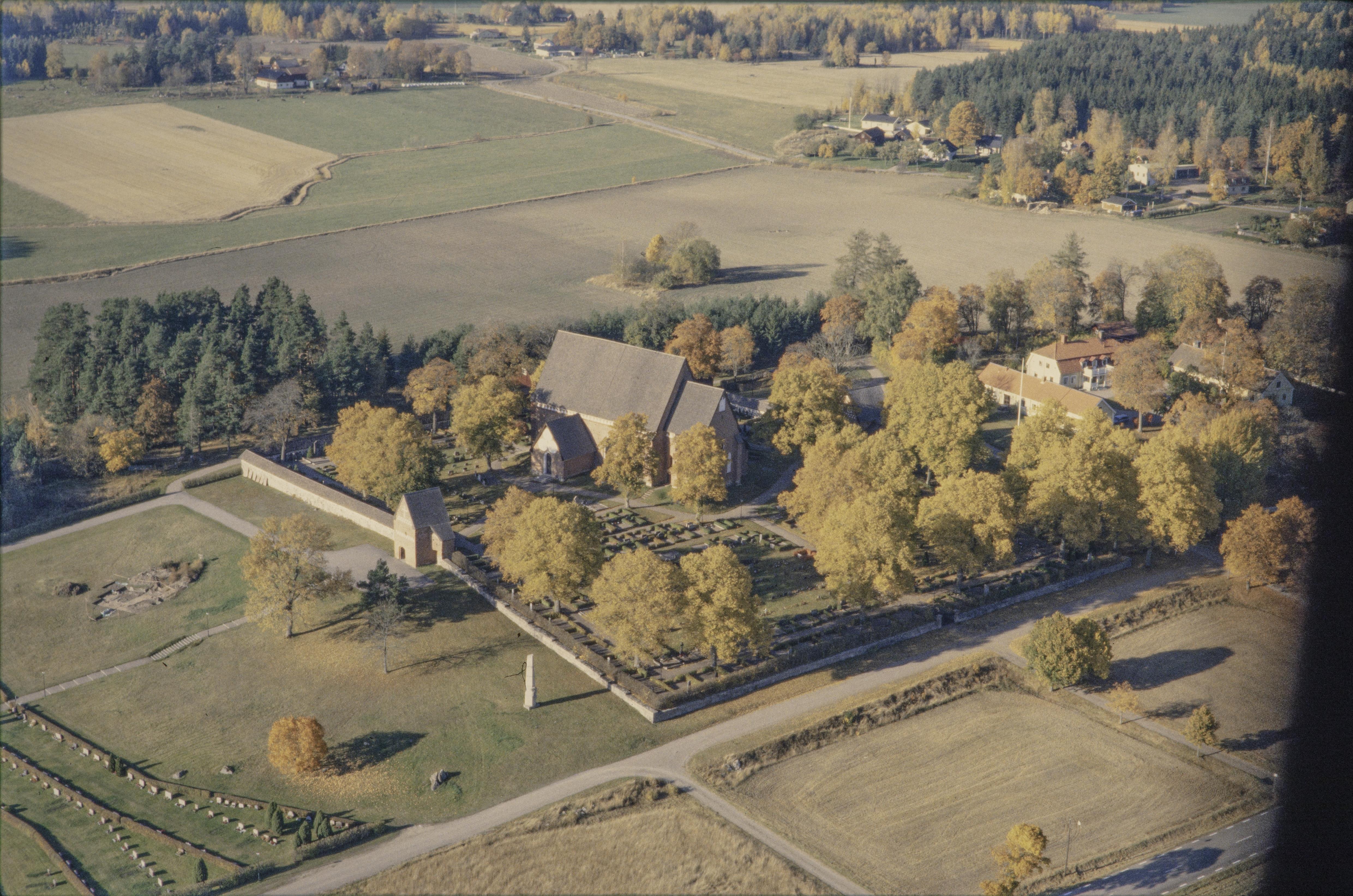 Beskrivning: Vendels kyrka och Vendels prästgård. Nere till vänster minnesmärke och båtgravfält RAÄnr Vendel 9:1-2. Bilden är tagen mot (väderstreck): N