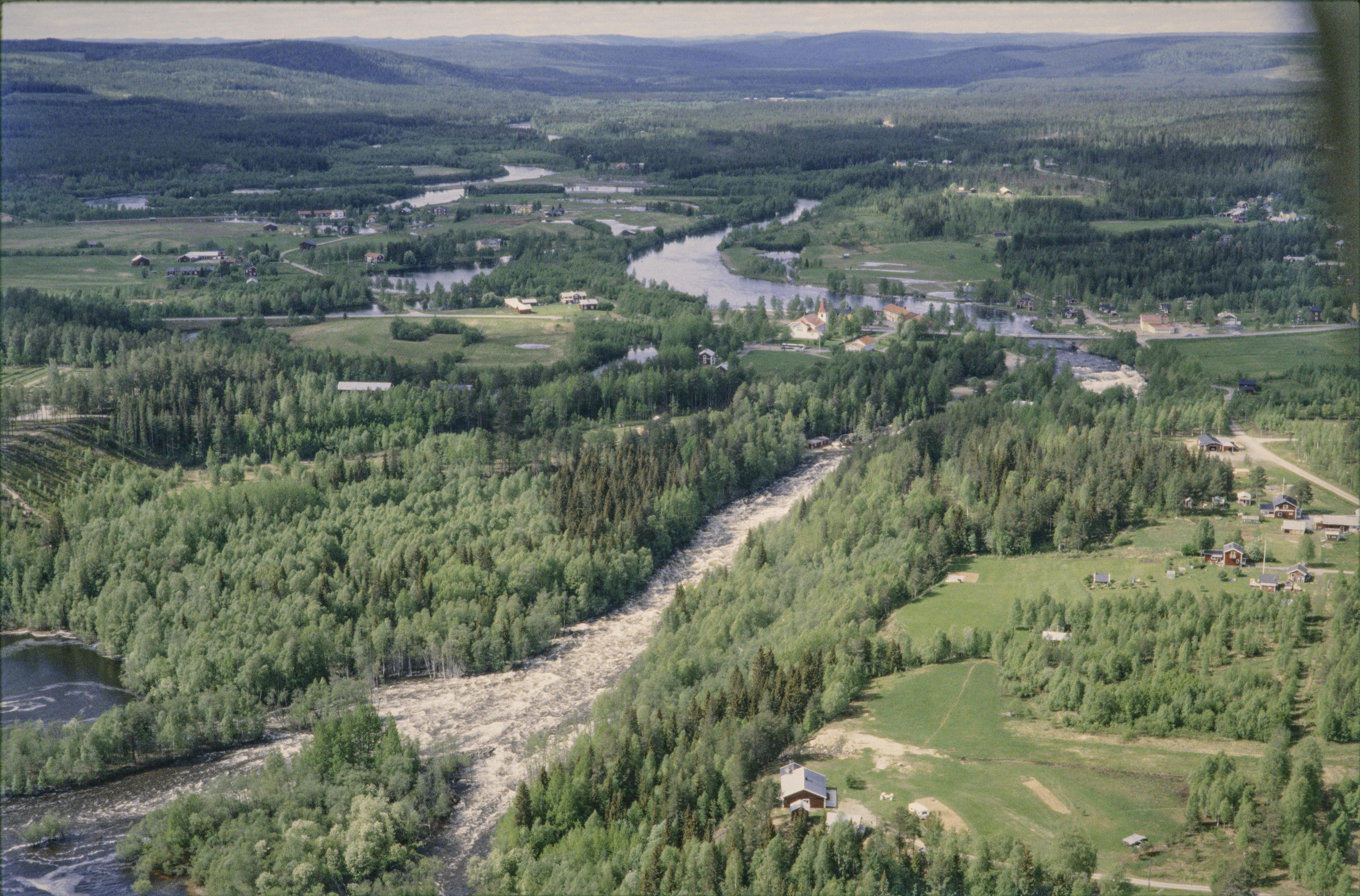 Beskrivning: Byskeälven vid Fällfors kyrkby. Fällfors kyrka till höger över bildens mitt. På Stödmyran vid bildens mitt fornlämningsplatsen RAÄnr Byske 912:1. Bilden är tagen mot (väderstreck): NV