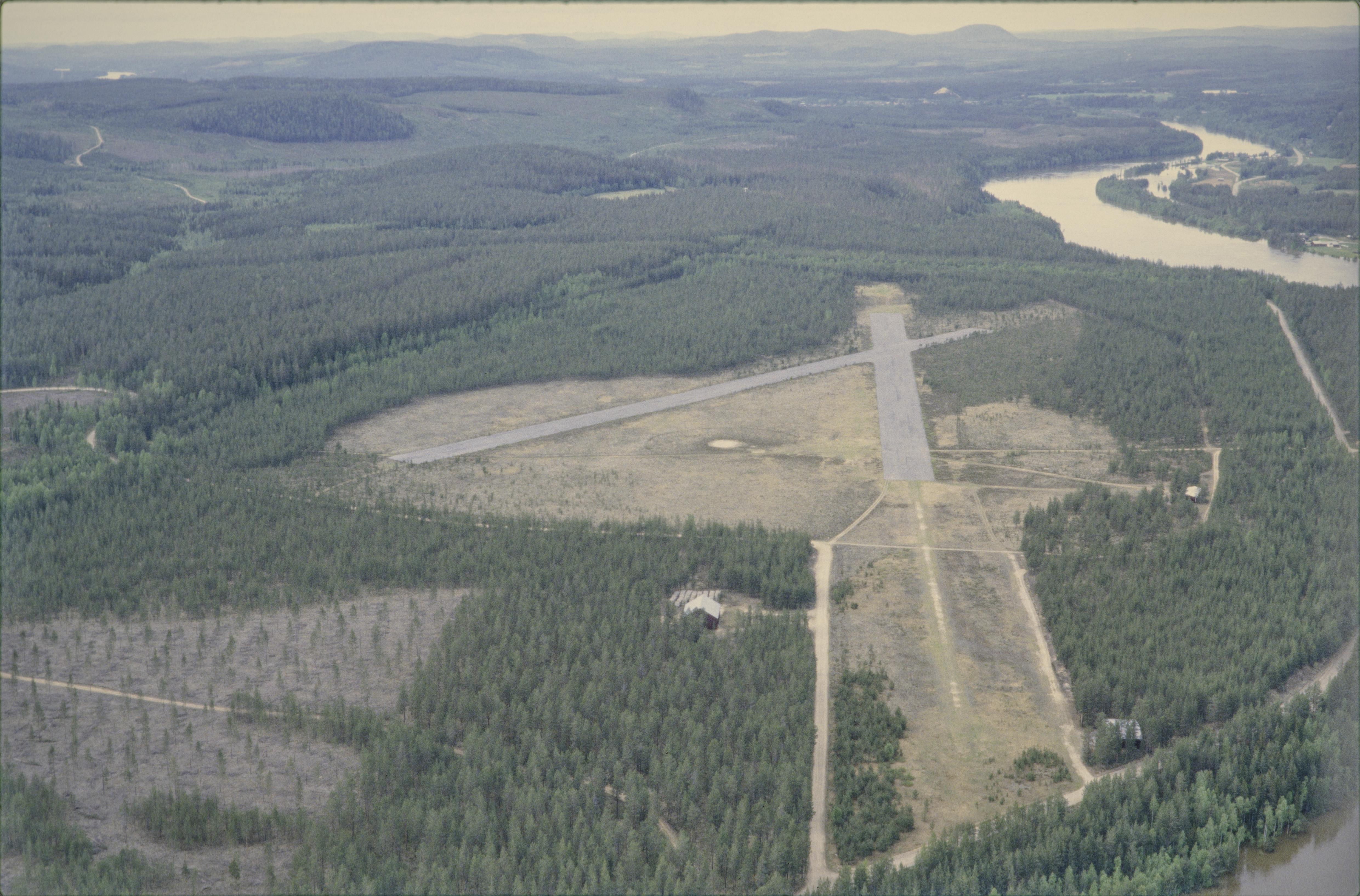 Beskrivning: Vindelns flygplats/flygfält i Vindelälvens dalgång mellan tätorten Hällnäs i nord och tätorten Vindeln i söder. Det nu nedlagda flygfältet tjänstgjorde som flygbas under andra världskriget, RAÄnr Degerfors 848. Bilden är tagen mot (väderstreck): NNV
