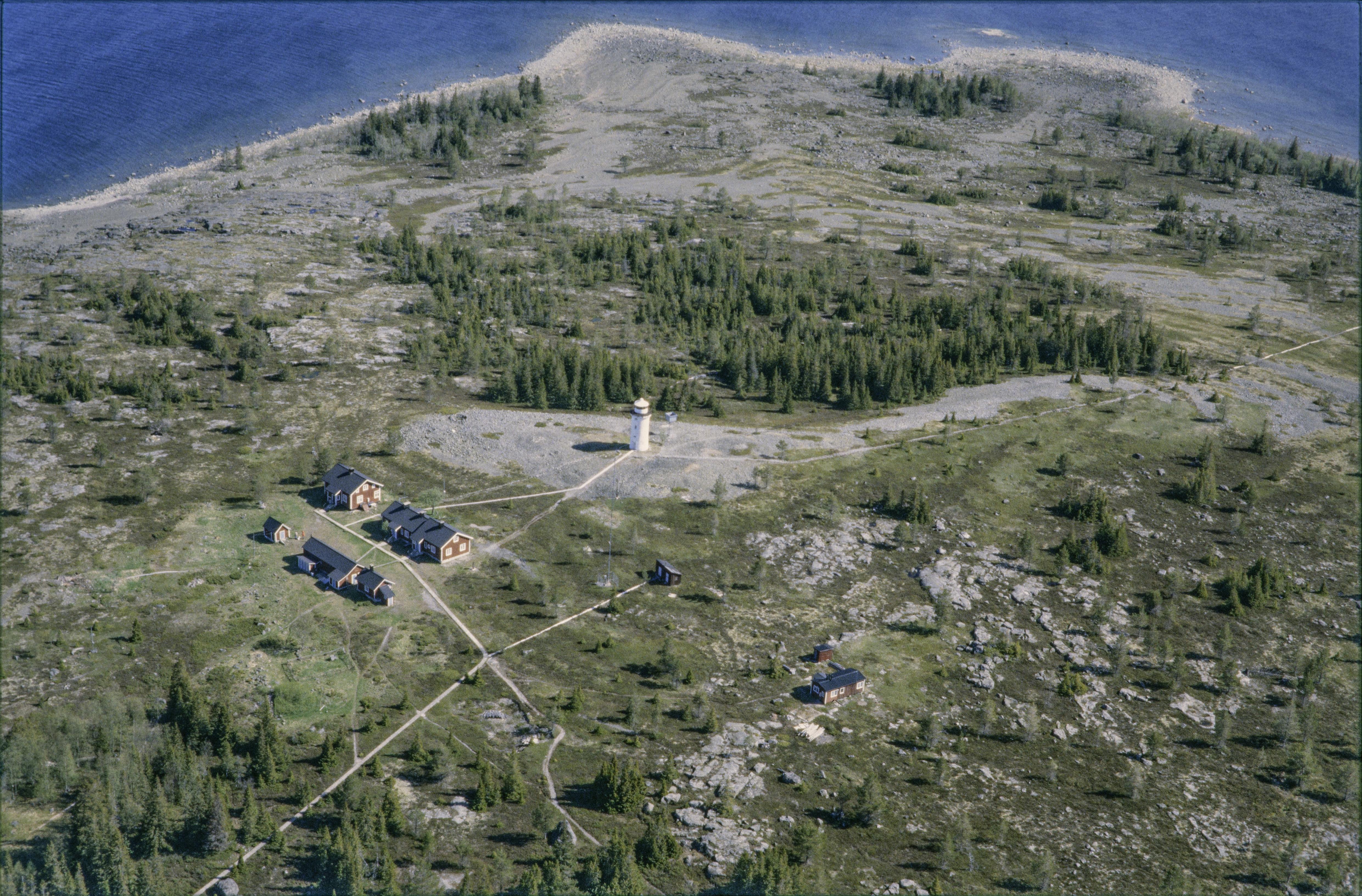 Beskrivning: Ön Stor-Fjäderägg (skrivs även Stora Fjäderägg). Vid bildens mitt fyrplats RAÄnr Holmön 28:1. På ön även flera labyrinter. Stor-Fjäderägg ingår i ögruppen Holmöarna i sundet Norra Kvarken. Bilden är tagen mot (väderstreck): NNO
