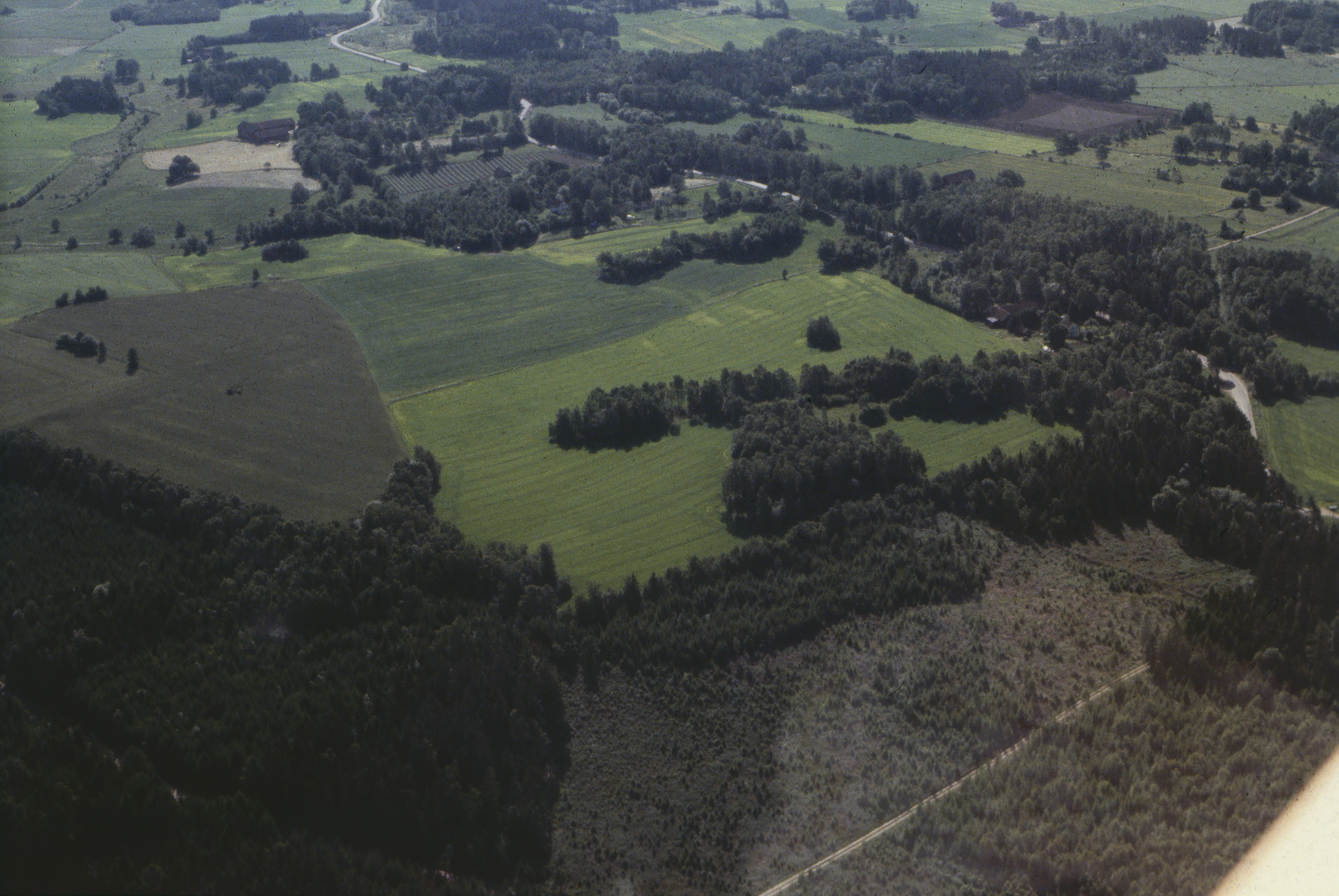 Beskrivning: Kullaskogen vid Lundatorp, vid gränsen mellan socknen Södra Lundby och Larv. I bildens nedre del högarna Lilla Kyrkehögen RAÄnr Södra Lundby 5:1 och Haraldskullen Södra Lundby 3:1, begravningsplats Södra Lundby 8:1 m.m. Bilden är tagen mot (väderstreck): Ö