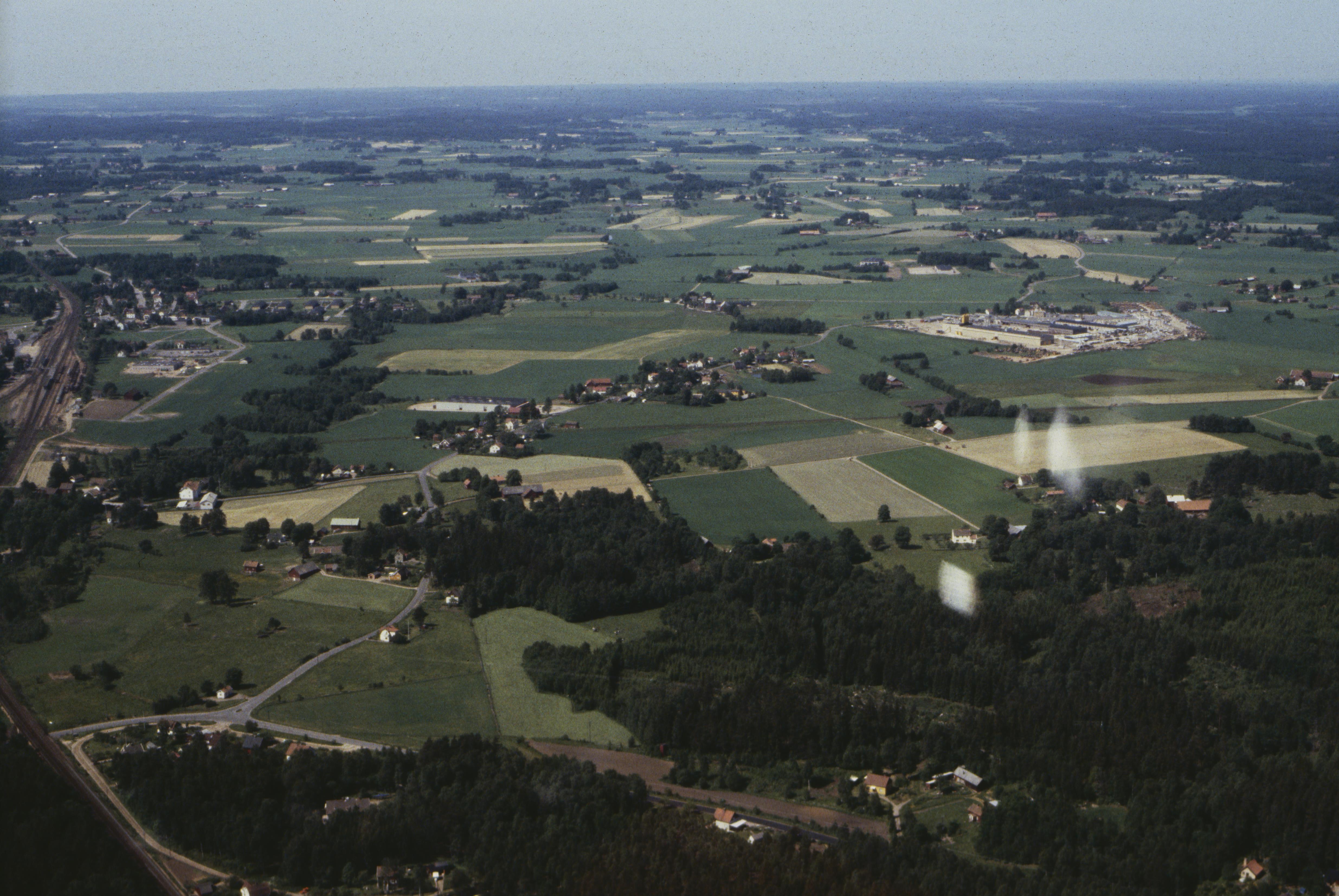 Beskrivning: Herrljunga tätort vid ån Nossan i bildens vänstra kant. Ån markerar gränsen mellan socknen Herrljunga (i bildens nedre del och till vänster), Tarsled (i mitten) och Fölene (till höger). Tarsleds kyrka vid bildens mitt. Bilden är tagen mot (väderstreck): VSV