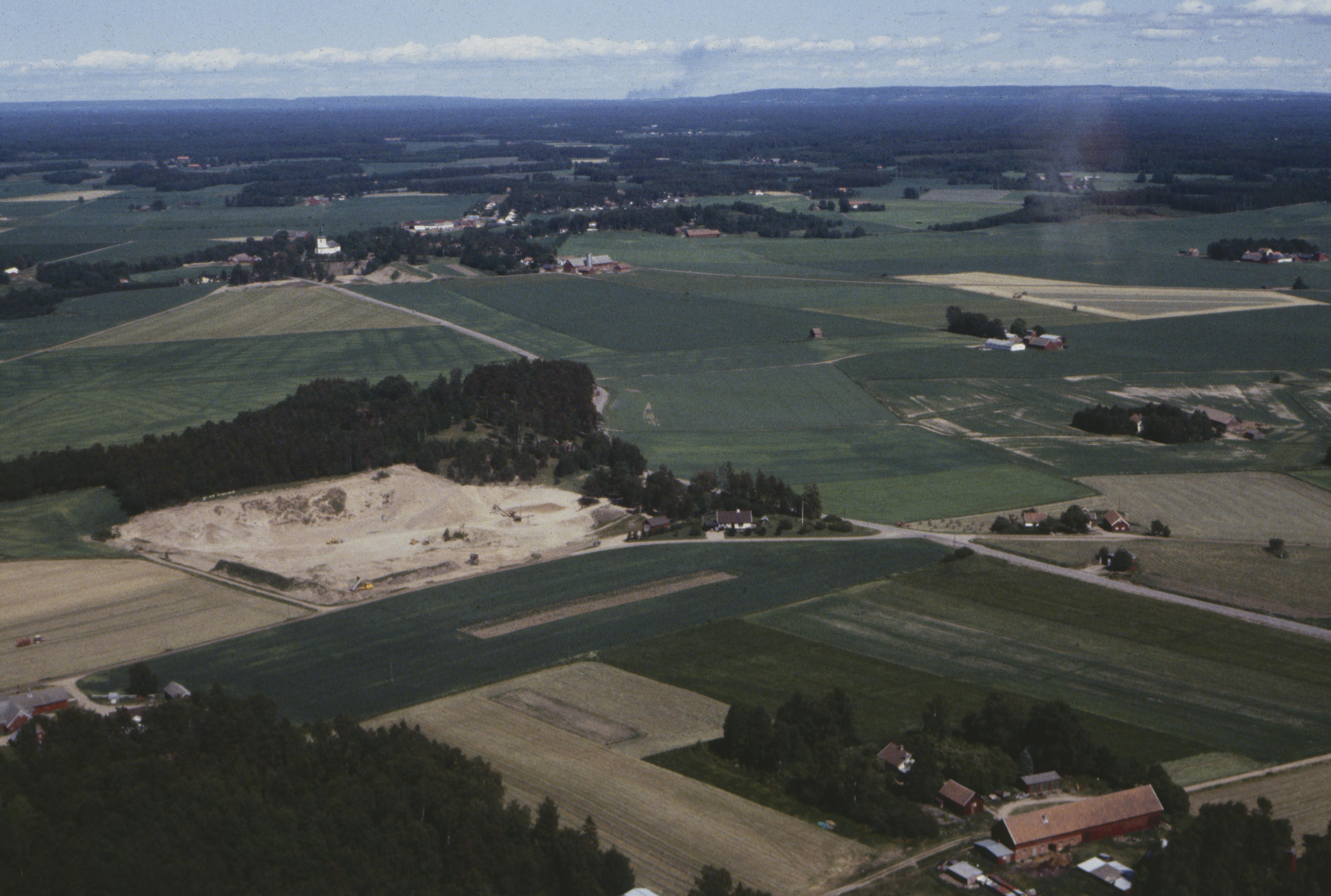 Beskrivning: Gravfält RAÄnr Larv 21:1 vid bildens mitt. Larvs kyrka och kyrkby vid ån Nossan till vänster i bildens övre del. Bilden är tagen mot (väderstreck): SO
