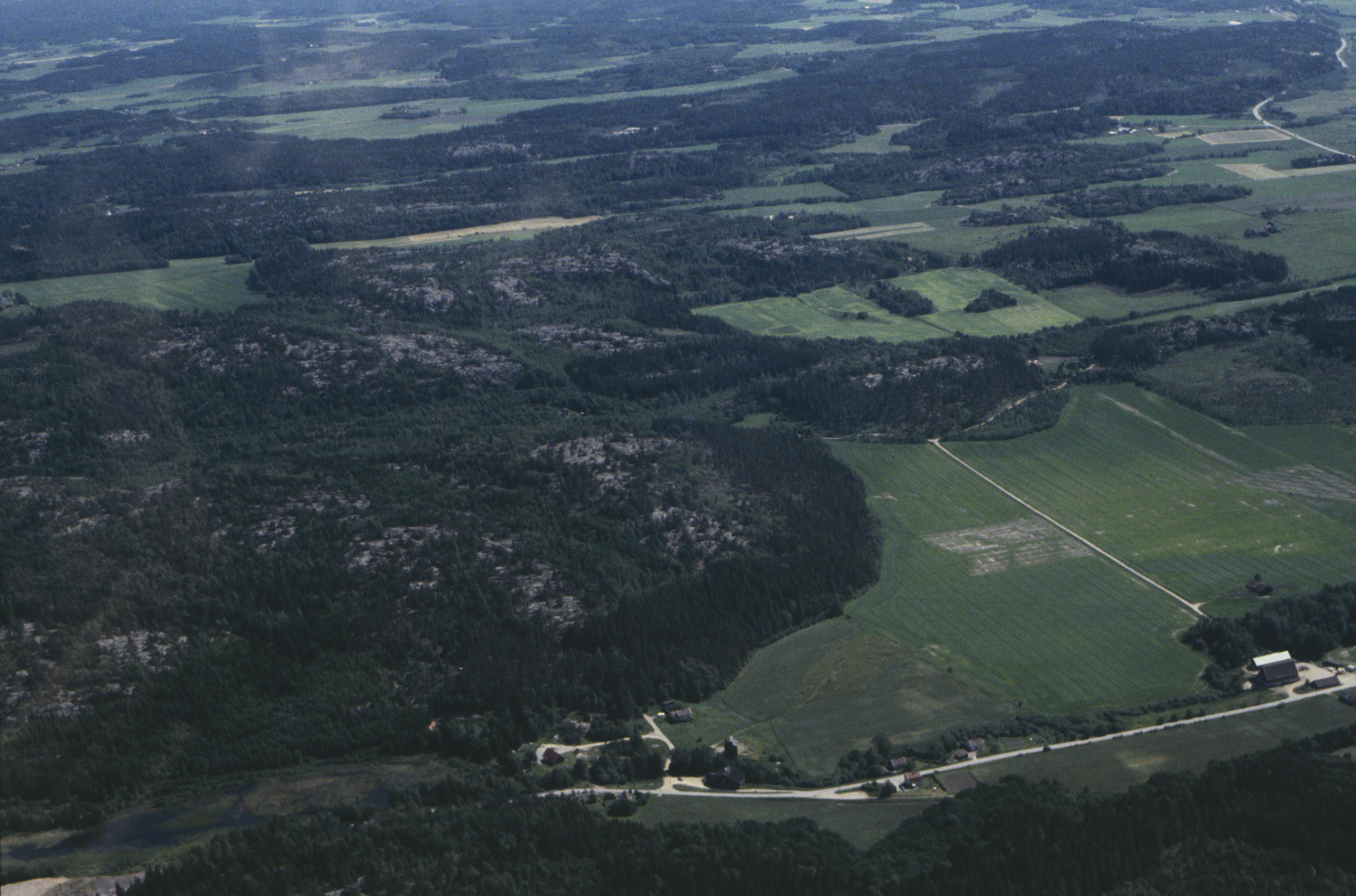 Beskrivning: Blomsholms by och herrgård i bildens nedre del. Skeppssättning RAÄnr Skee 343:1 till höger under bildens mitt. I bildens övre del byarna Rogsta och Hee m.fl. Bilden är tagen mot (väderstreck): SO
