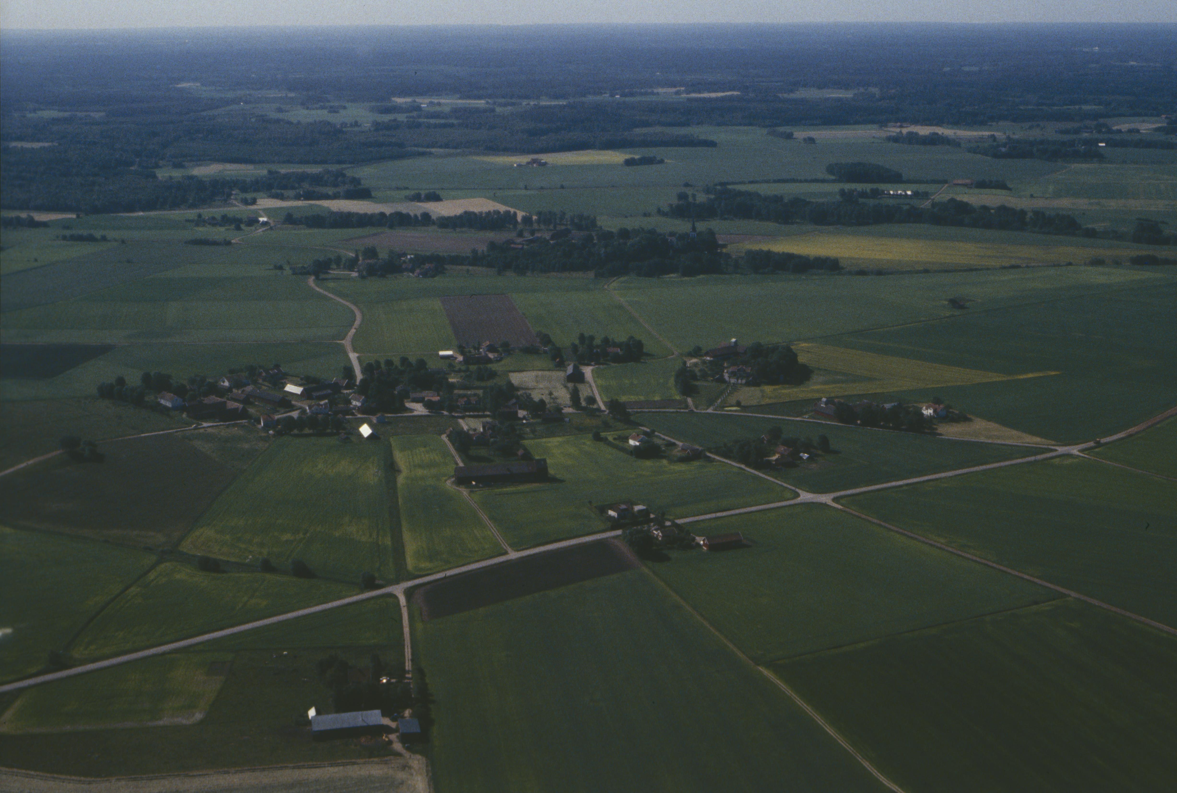 Beskrivning: Vånga by. Till höger över bildens mitt Norra Vånga kyrka och kyrkby. Bilden är tagen mot (väderstreck): S