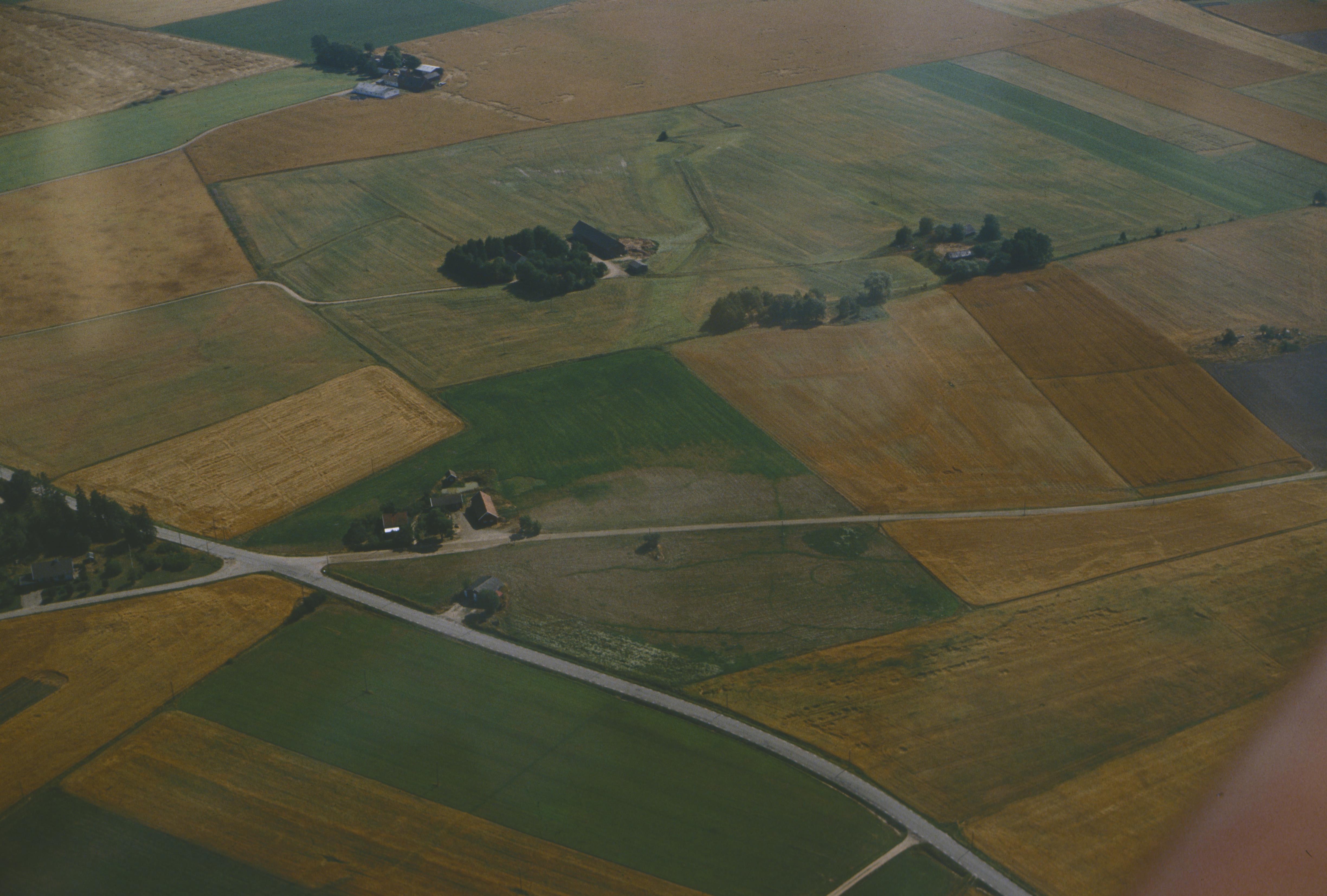 Beskrivning: Cropmarks i åker. Vid bildens mitt domarring RAÄnr Larv 32:1 och hög och stensättning Larv 39:1-2, m.fl. Bilden är tagen mot (väderstreck): Ö