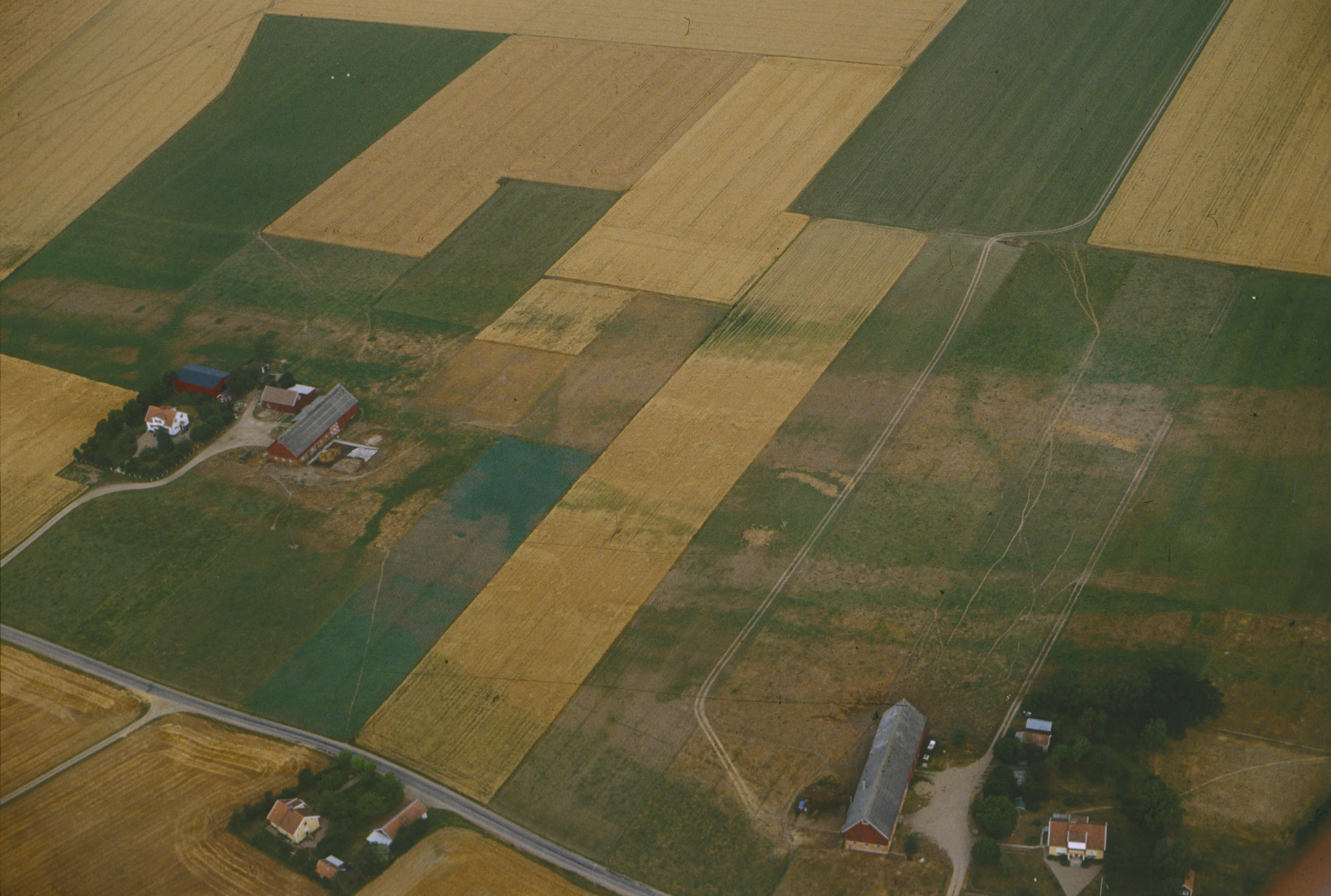 Beskrivning: Cropmarks i åker i västra delen av Längjum kykrby. Vid bildens mitt hög RAÄnr Längjum 63:1. Bilden är tagen mot (väderstreck): NV