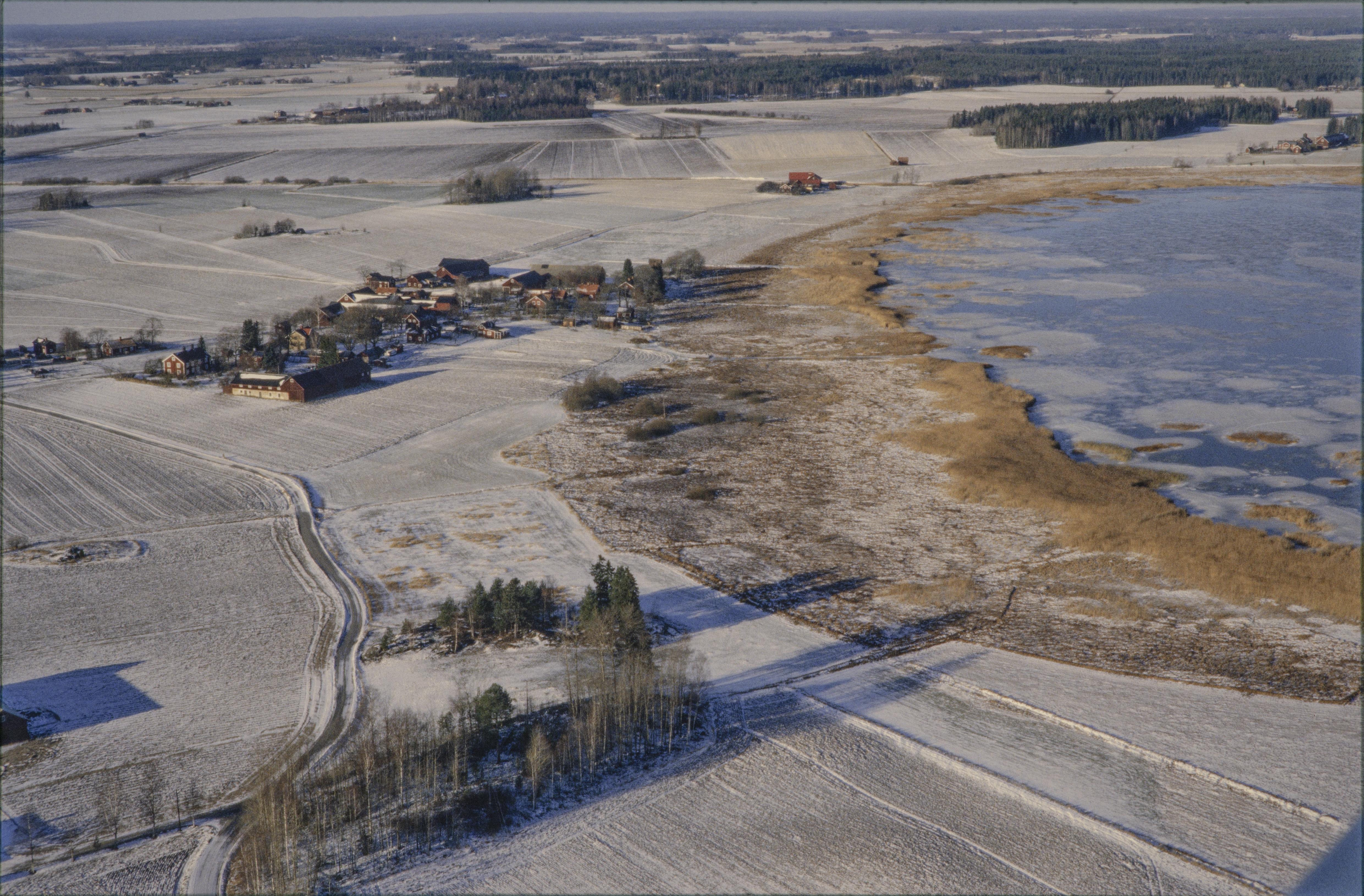Beskrivning: Gussjö by vid Gussjön. Vid bildens mitt fornlämningsområde med husgrund RAÄnr Fläckebo 132:1. Nere till vänster hällristning RAÄnr Fläckebo 218, runristning Fläckebo 2:1, m.fl. Bilden är tagen mot (väderstreck): NNV
