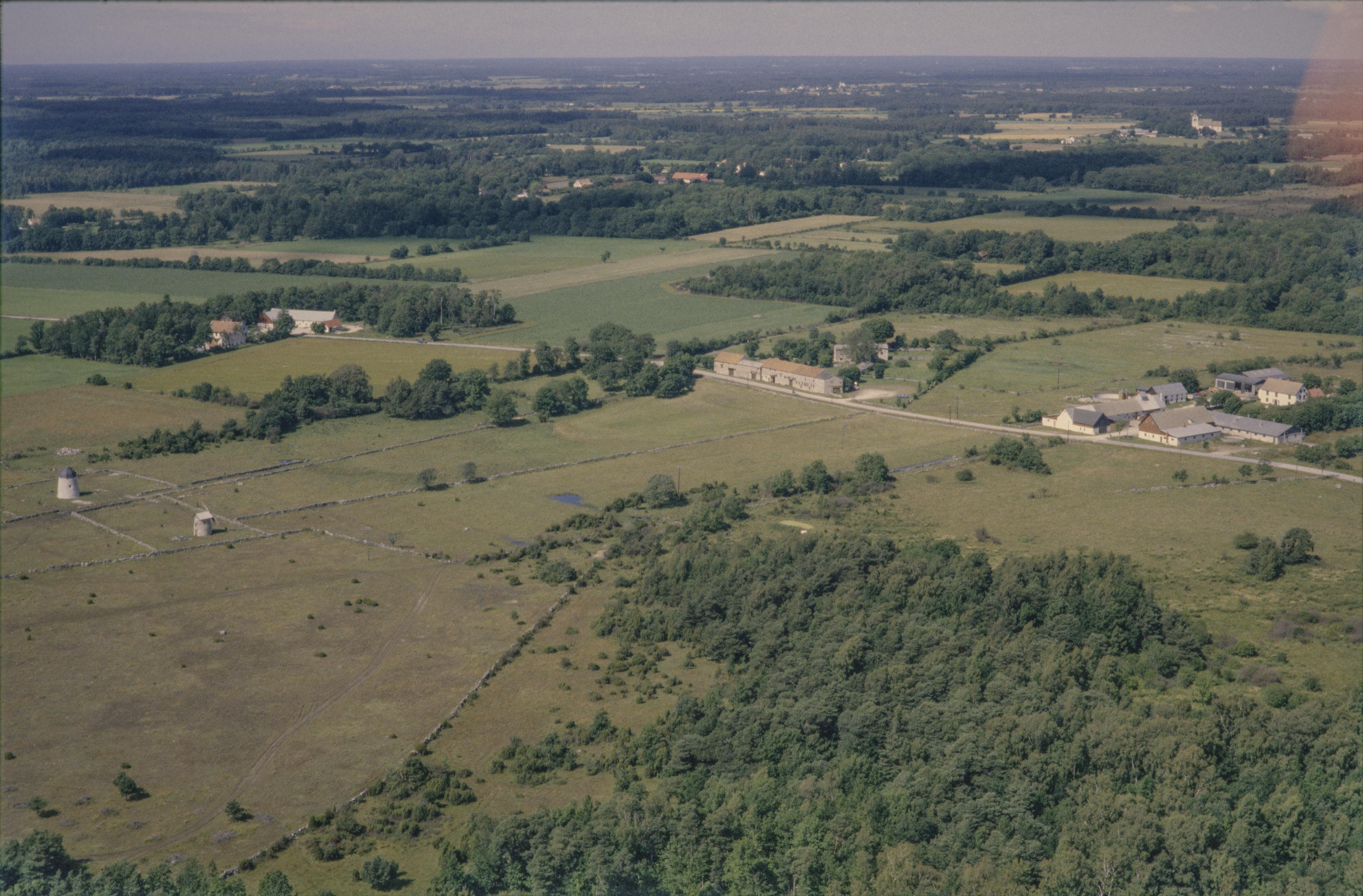 Beskrivning: Kattlunds gård / museigård och byggnadsminne RAÄnr Grötlingbo 55:2 över bildens mitt. Uddvide gård till höger. Grötlingbo kyrka till höger i bildens övre del. Bilden är tagen mot (väderstreck): N
