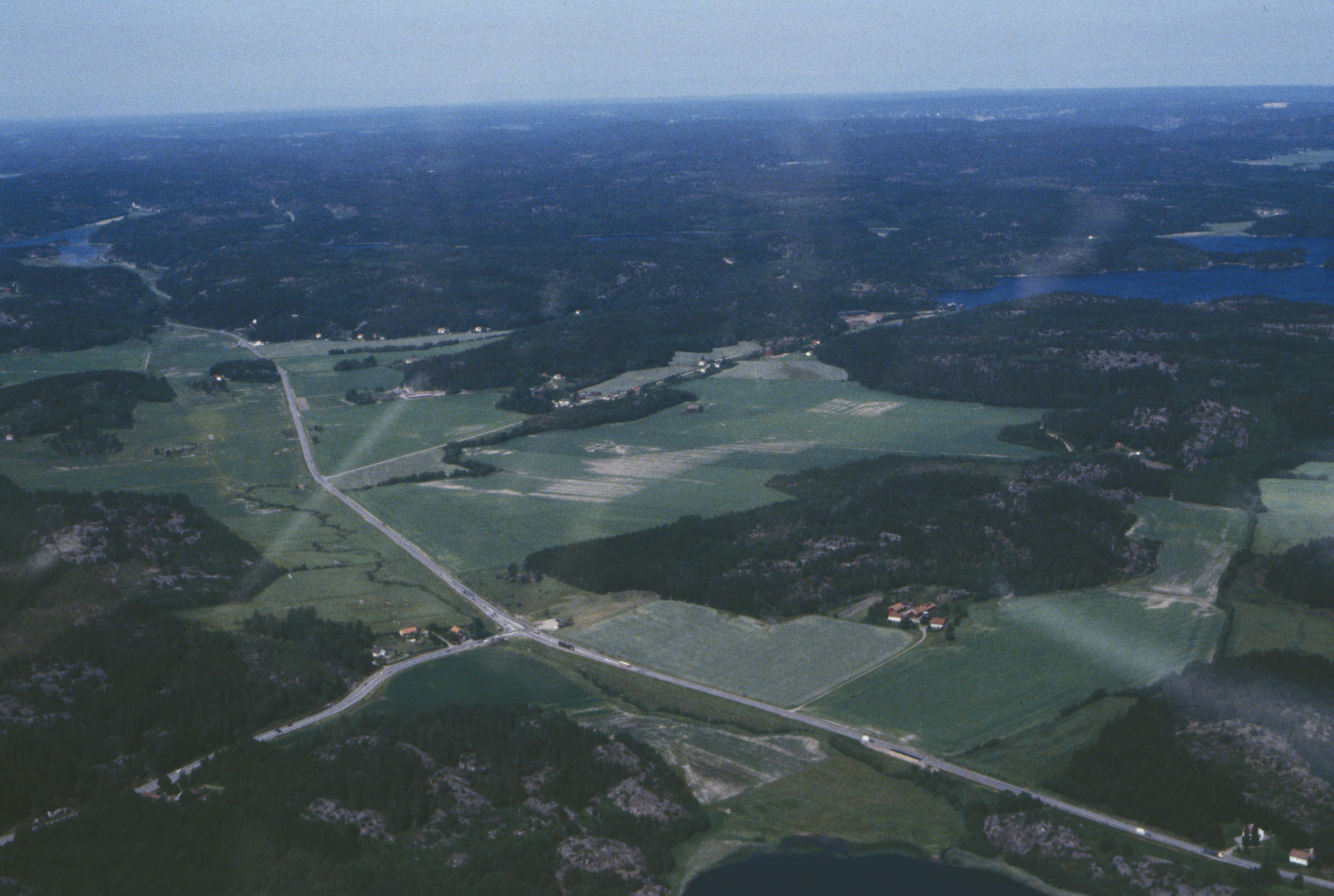 Beskrivning: Blomsholms herrgård. Skeppssättning RAÄnr Skee 343:1 till vänster under bildens mitt. I bildens övre del S nedre del sjön Strömsvattnet. (naturreservat). Uppe till vänster Hogdals kyrka vid fjorden Dynekilen i Hogdals socken. Uppe till höger sjön Färingen. Bilden är tagen mot (väderstreck): NV