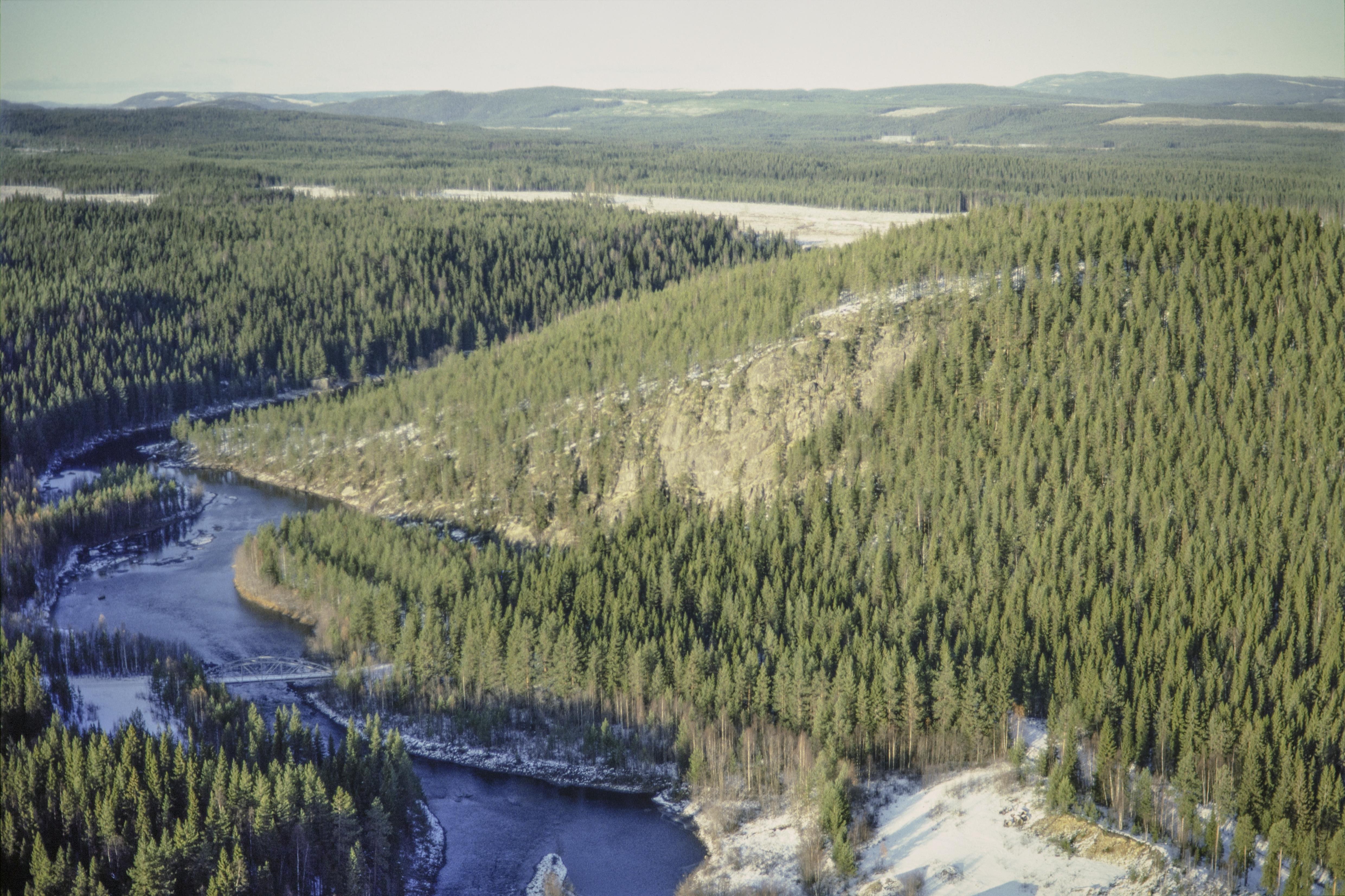 Beskrivning: Brattforsberget vid Storån, Malmån och Vängelälven. I bergsidan vid bildens mitt hällmålningar RAÄnr Fjällsjö 191:1. Bilden är tagen mot (väderstreck): N