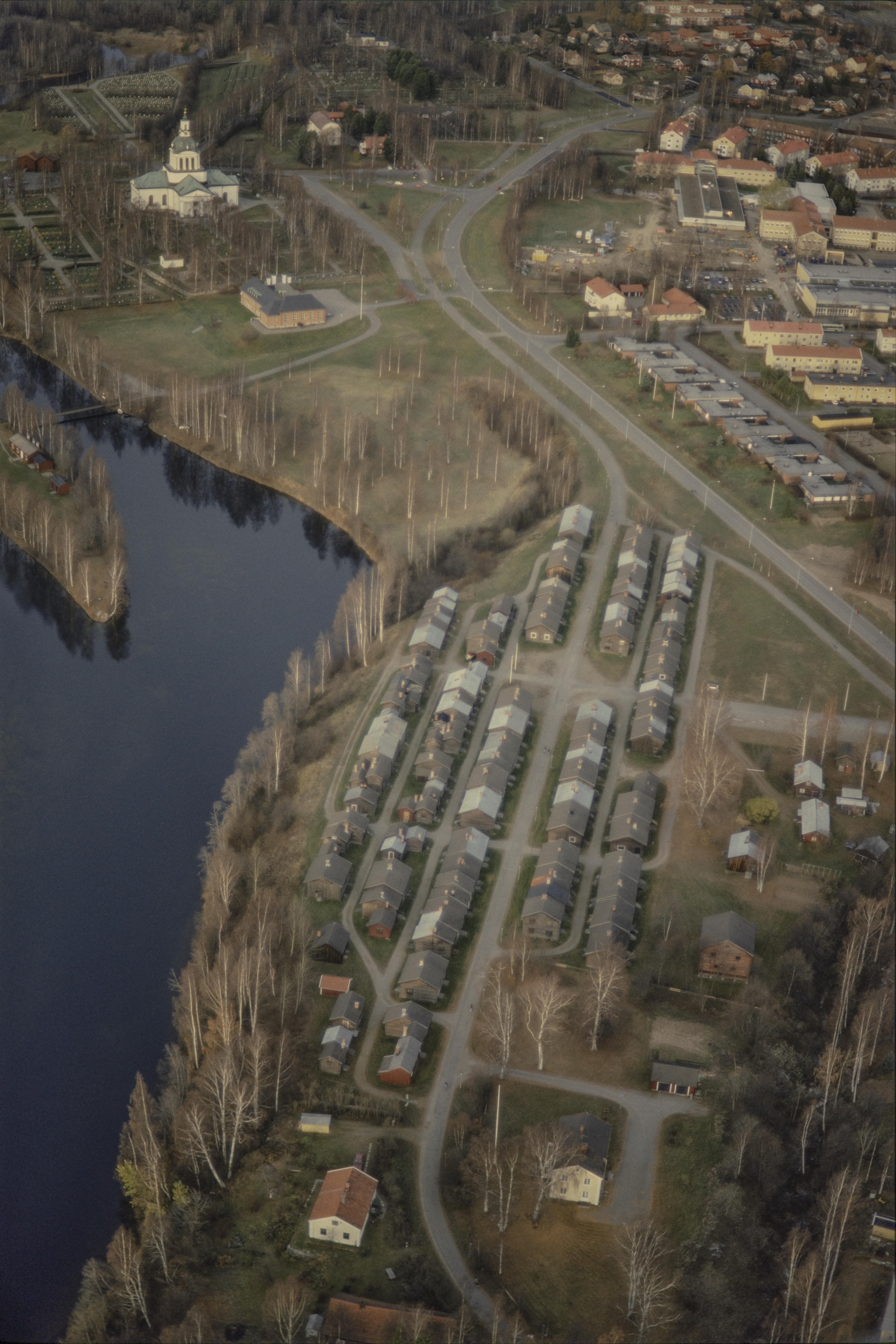 Beskrivning: Skellefteå stad och tätort vid Skellefteälven. I bildens nedre kant gränsen mellan socknen Skellefteå stad (i bildens nedre kant) och Skellefteå socken. Kyrkstaden Bonnstaden RAÄnr Skellefteå stad 140:1 i bildens nedre del. Landskyrkan uppe till vänster. Bilden är tagen mot (väderstreck): V