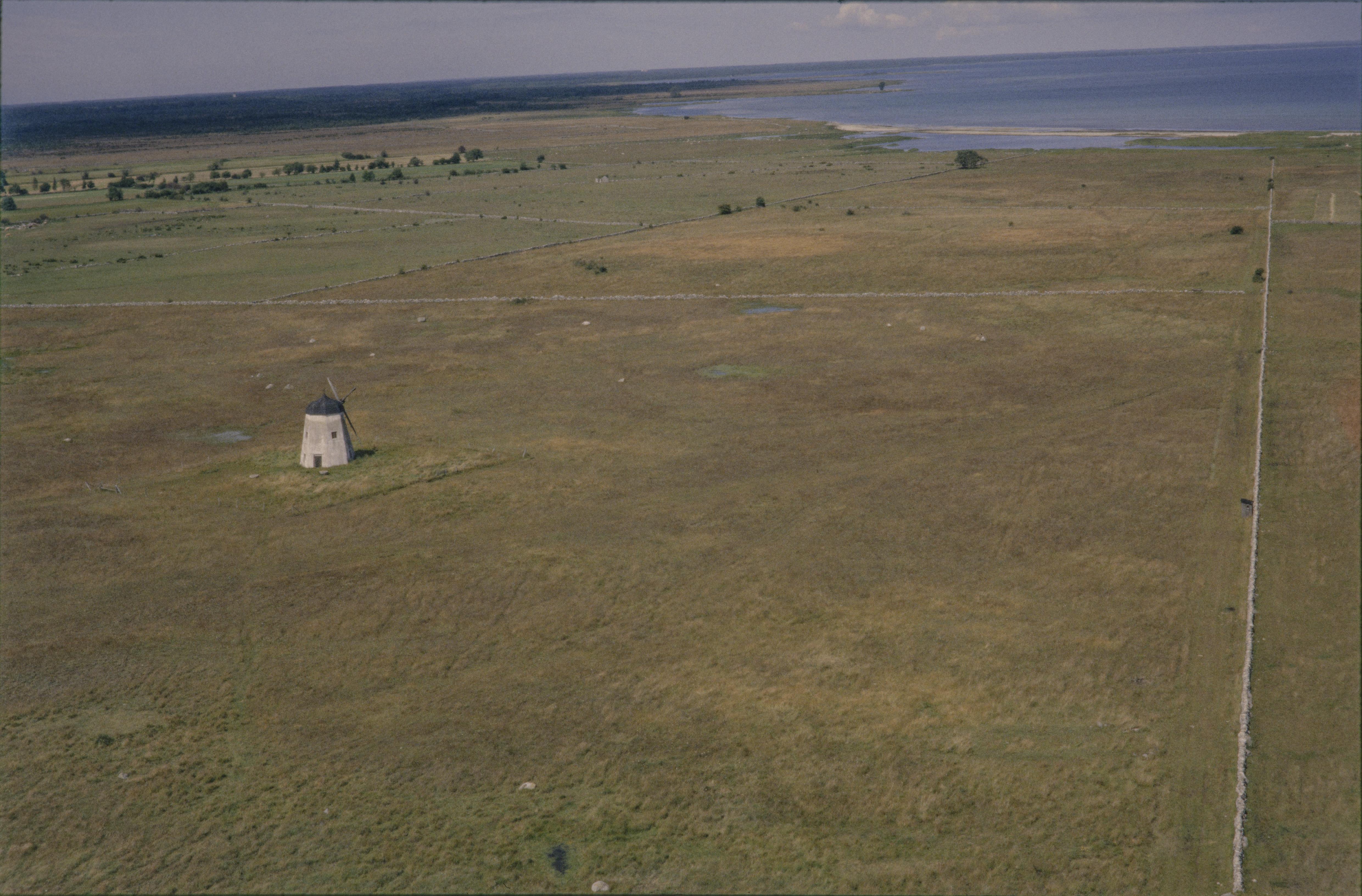 Beskrivning: Väderkvarn mellan gårdarna Barkarve och Burge i Faluddens nordvästra del. Till vänster över bildens mitt området Barkarve och en sten med ristning (slipränna) RAÄnr Öja 60:1. Fide kyrka skymtas till vänster i bildens övre kant. Bilden är tagen mot (väderstreck): N