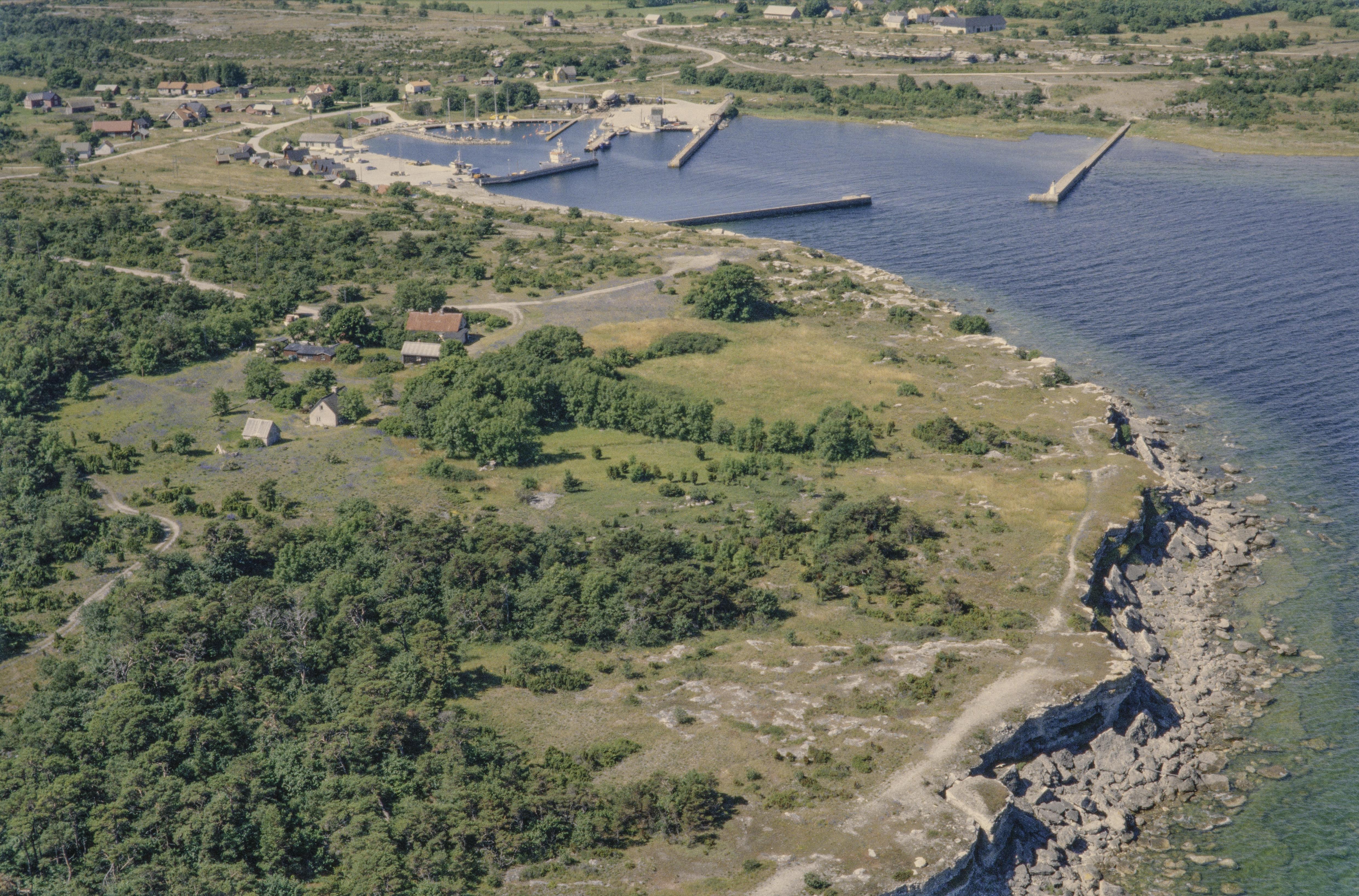 Beskrivning: Herrviks fiskeläge och tidigare lotsplats. Över bildens mitt härd RAÄnr Östergarn 40:1 vid bryggan. Herrviks kapell uppe i bildens vänstra hörn. Bilden är tagen mot (väderstreck): VSV