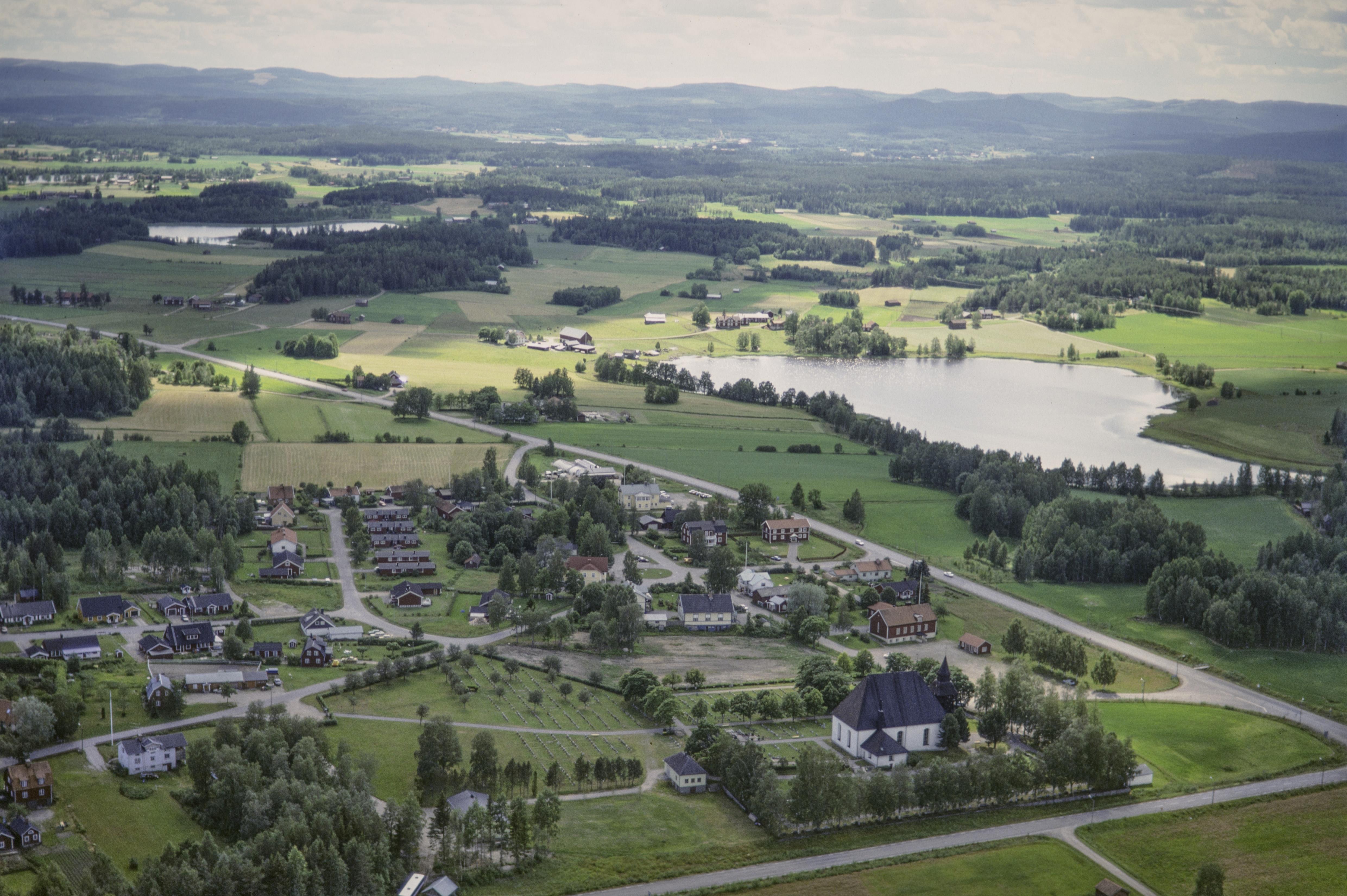 Beskrivning: Bjuråkers kyrkby. Bjuråkers kyrka nere till höger. Sjön Tjärnatjärnet till höger om bildens mitt, Rångsjön uppe till vänster. Vid vägen under kyrkan fyndplats (östromerskt guldmynt) RAÄnr Bjuråker 183:1. Bilden är tagen mot (väderstreck): SSV