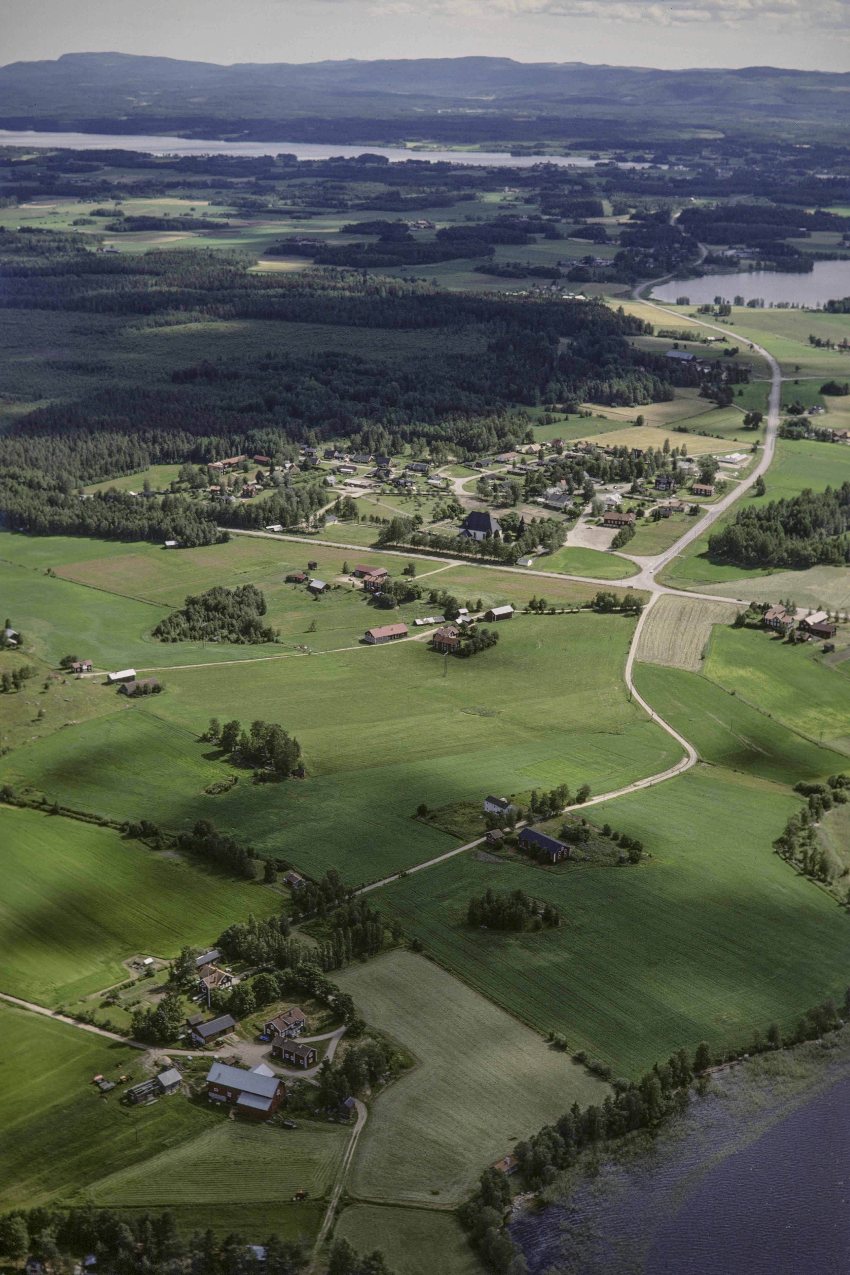 Beskrivning: Sjön Norrdellen (skrivs även Norr Dellen) nere till höger. I bildens nedre del området Näppänge med hög RAÄnr Bjuråker 2:1. Vid bildens mitt Bjuråker kyrka och kyrkby Uppe till höger sjön Rångsjön. Bilden är tagen mot (väderstreck): S