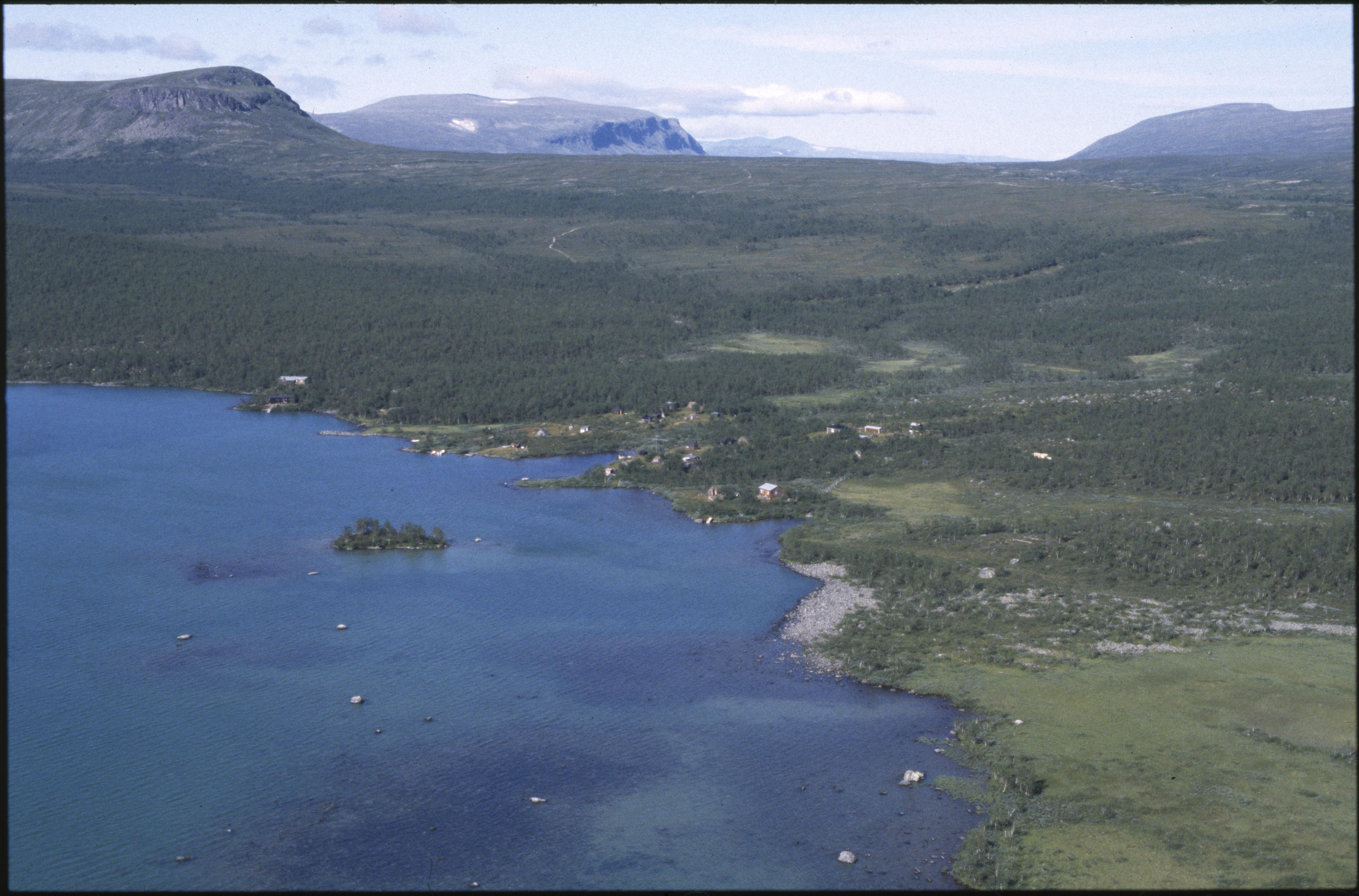 Beskrivning: Sitojaurestugorna i Vaggevare (Vaggevaratj / Vággevárásj) sameviste i sydöstra ändan av sjön Sitojaure (Sijddojávrre). Vid bildens mitt boplats RAÄnr Jokkmokk 371:1, 372:1 och 374:1. Området ingår i Ultevis fjällurskogs naturreservat. Bilden är tagen mot (väderstreck): N