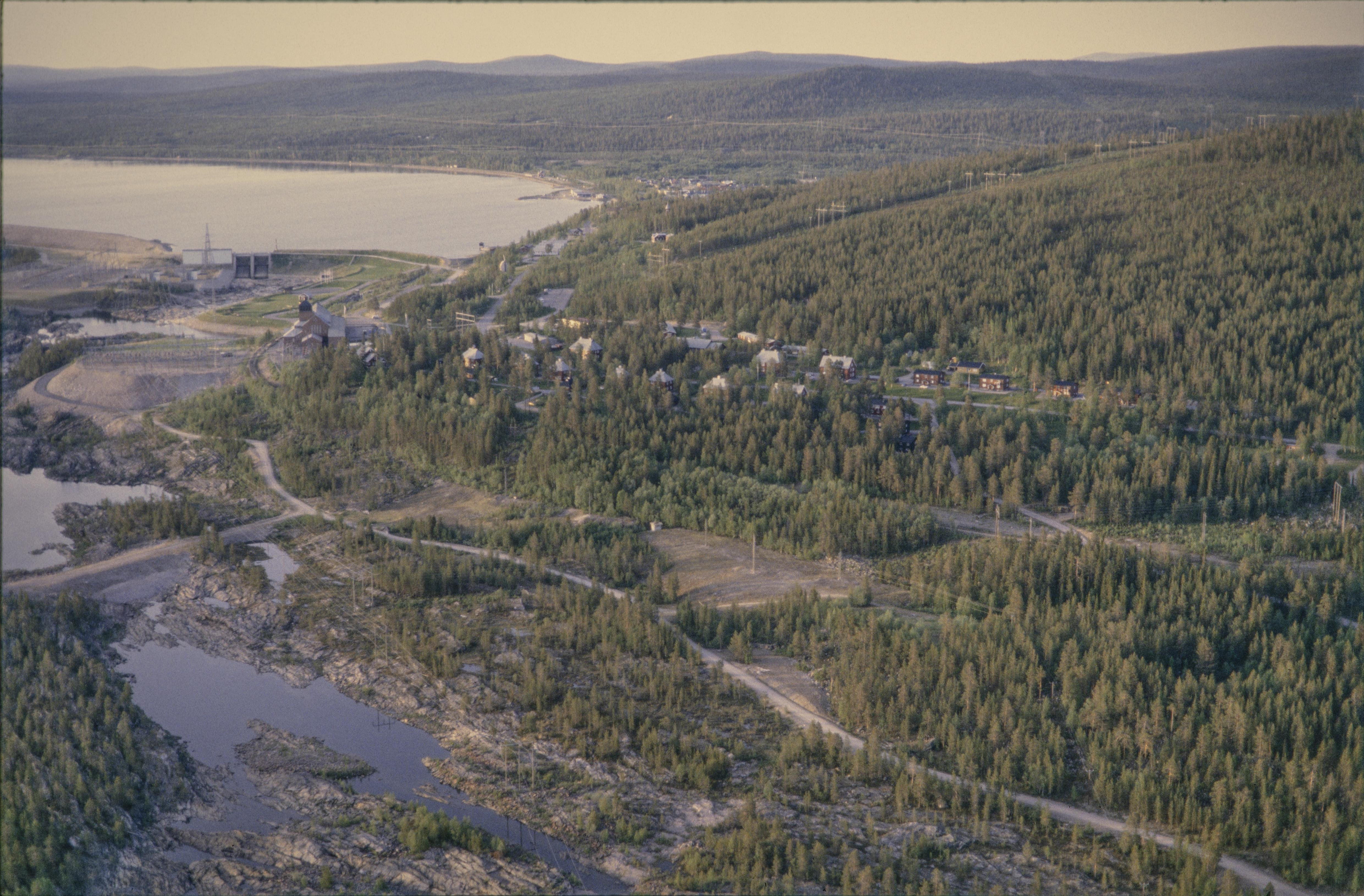 Beskrivning: Porjus (Bårjås) tätort och kraftverkssamhälle vid sjön Stora Lulevatten (Stuor Julevu) och Stora Luleälven (Stuor Julevädno). Uppe till vänster Porjus kraftverk (nya och gamla) och minnesmärke RAÄnr Jokkmokk 1750:1. Porjus gamla kraftverk är byggnadsminne och industriminne. Bilden är tagen mot (väderstreck): NO