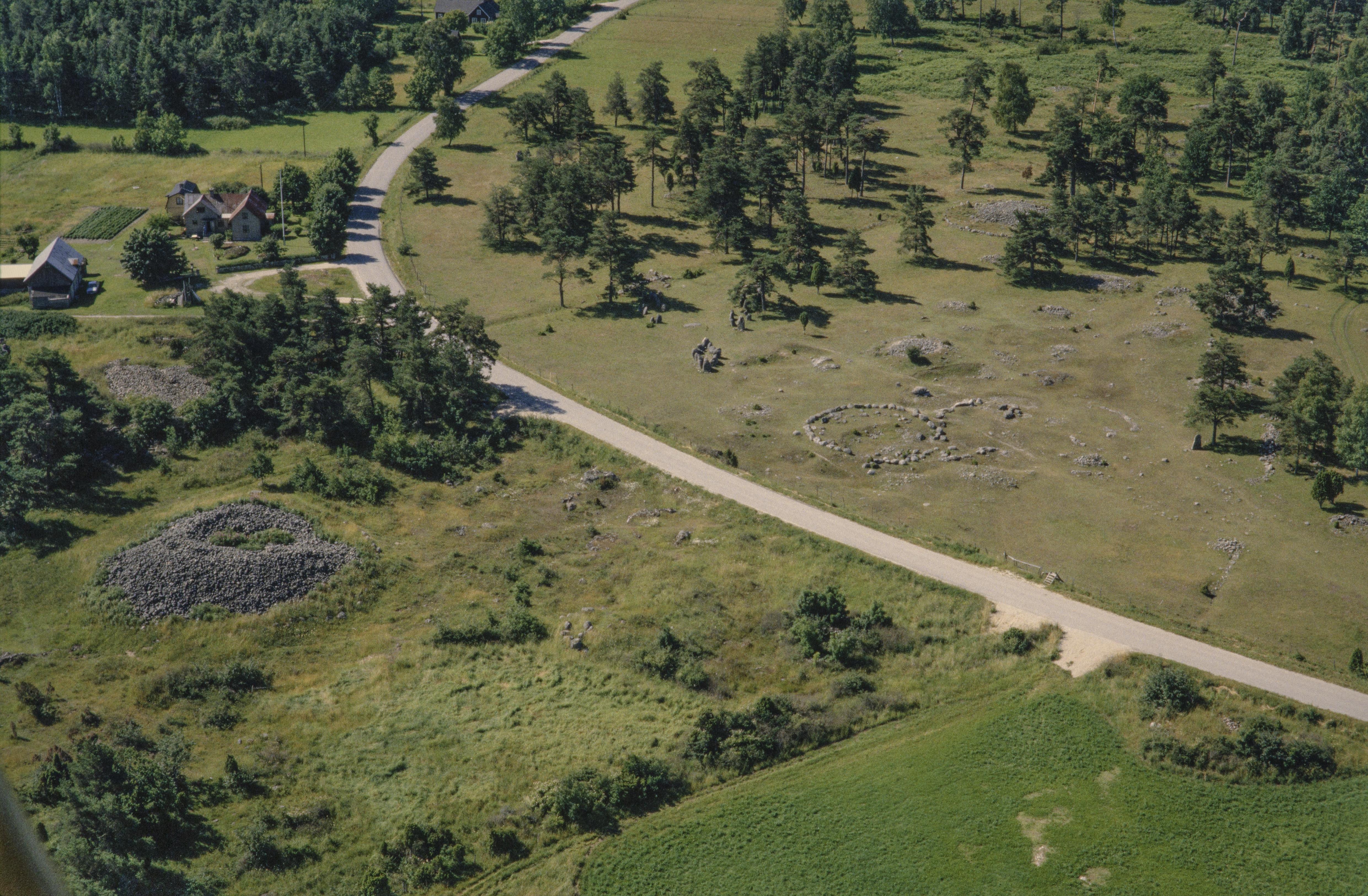 Beskrivning: På båda sidor av vägen Gålrums gravfält Alskog 9:1 med flera rösen och skeppssättningar m.m. Röset Digerrojr till vänster under bildens mitt. Bilden är tagen mot (väderstreck): SSV