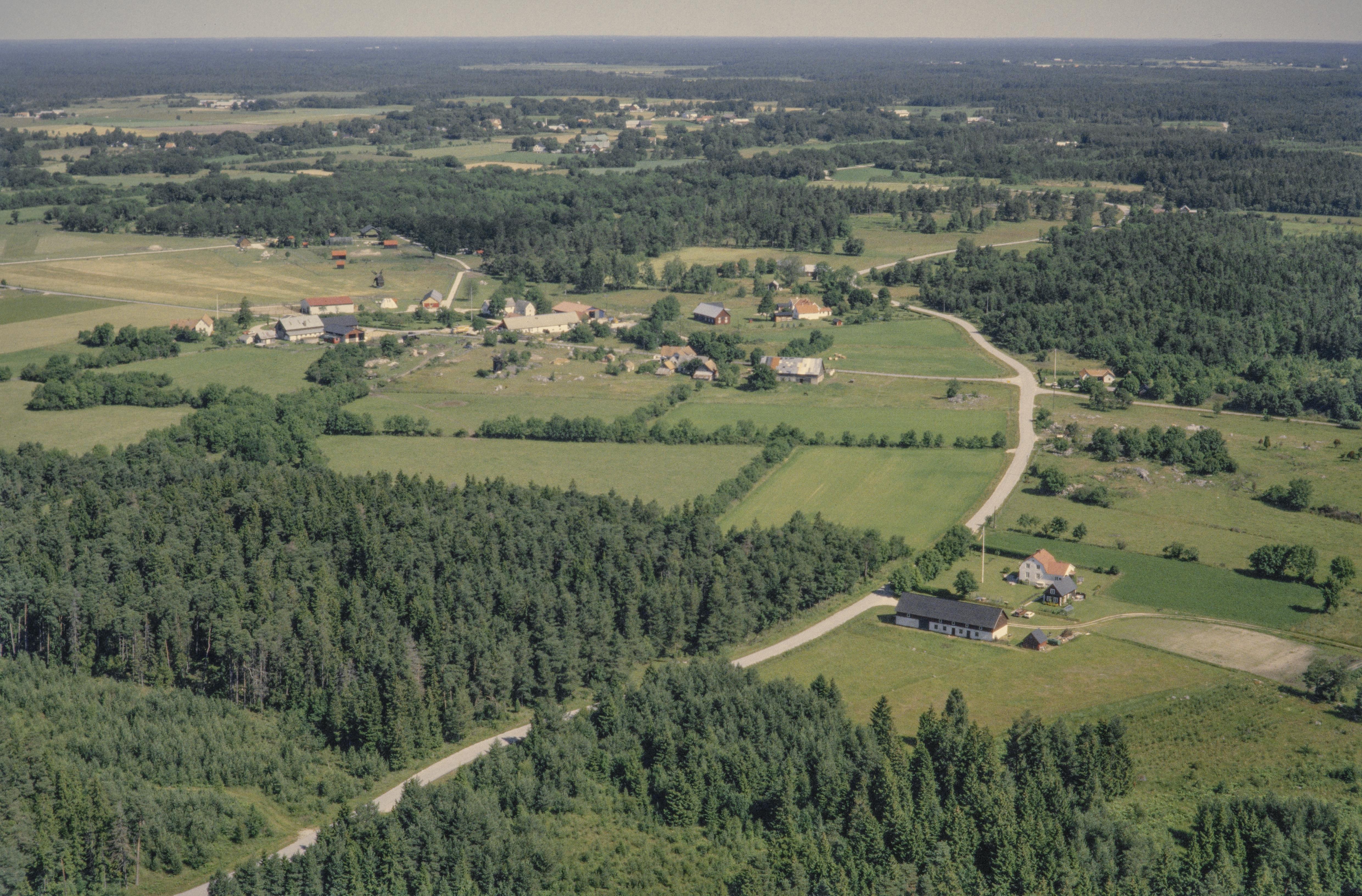 Beskrivning: Områdena Hallgårds och Utalskog i bildens nedre del. I kanten till höger om bildens mitt Hallgårds gamla tomt RAÄnr Alskog 269:1 med röse Alskog 241:1. I skogen uppe till höger skymtas Gålrums gravfält RAÄnr Alskog 9:1 med röset Digerrojr. Bilden är tagen mot (väderstreck): N