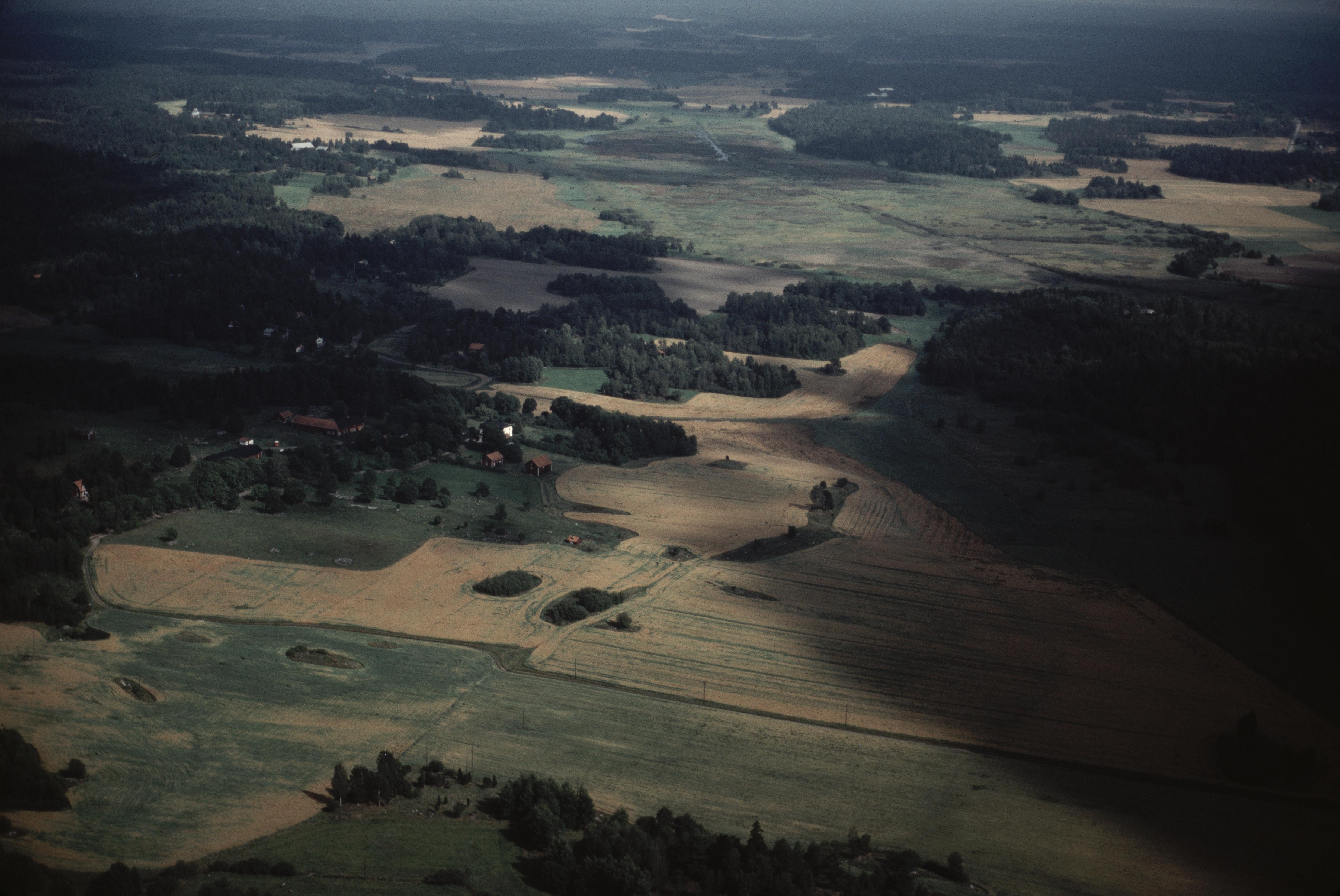 Beskrivning: Sydvästra delen av Angarnssjöängen, Långhundraleden vid Lingsbergs by. Till vänster om bildens mitt fornborg RAÄnr Vallentuna 265:1. Vid bildens mitt gravfält RAÄnr Vallentuna 251:1 m.fl. Uppe till höger Angarns socken. Bilden är tagen mot (väderstreck): ONO