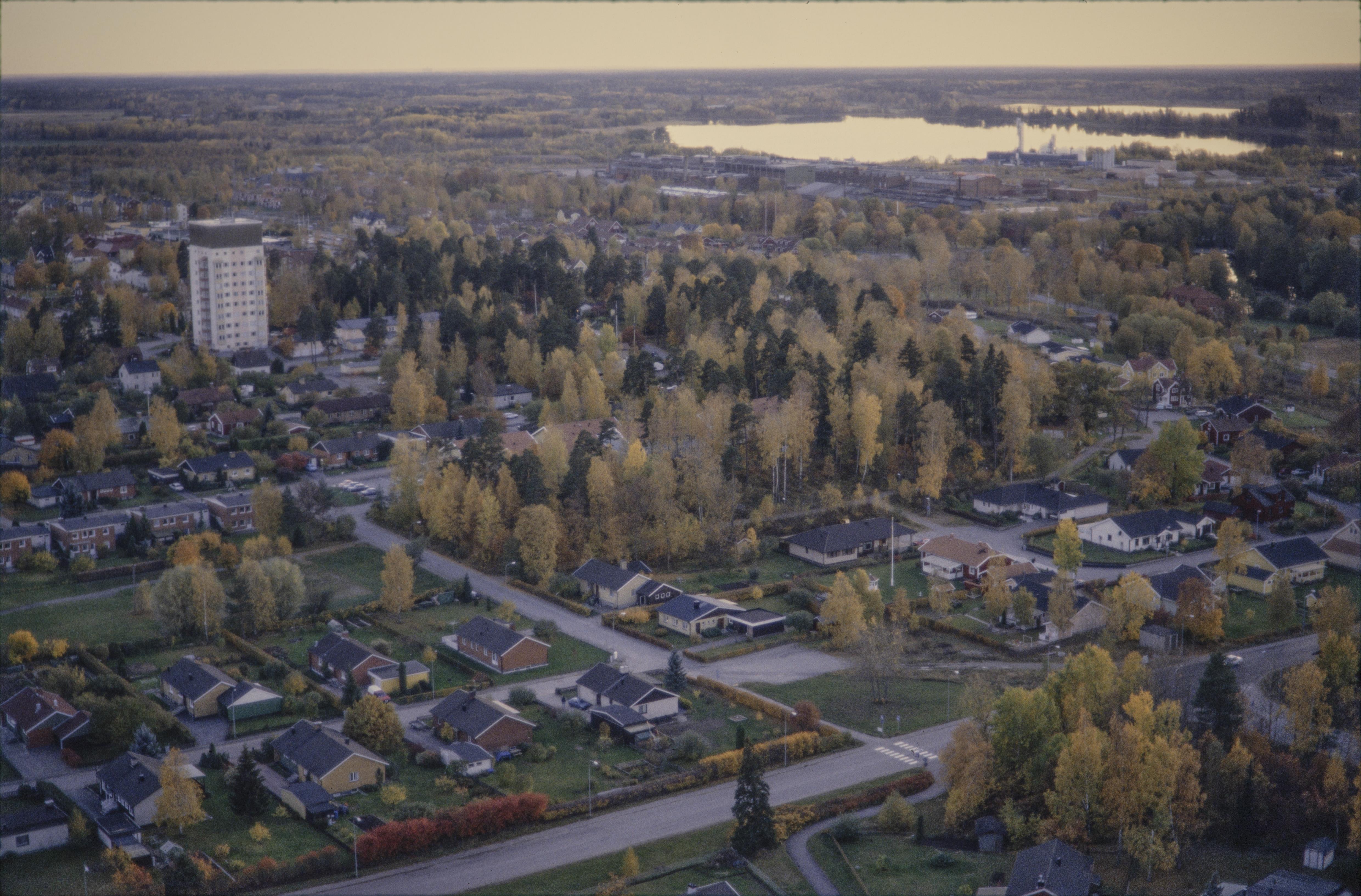 Beskrivning: Surahammars tätort och bruk RAÄnr Sura 49:1. Den höga byggnaden uppe till vänster står vid Skogsvägen och Bergsgatan. I bildens övre del Östersjön och byggnadsminnet Strömsholms kanal. Bilden är tagen mot (väderstreck): SSV