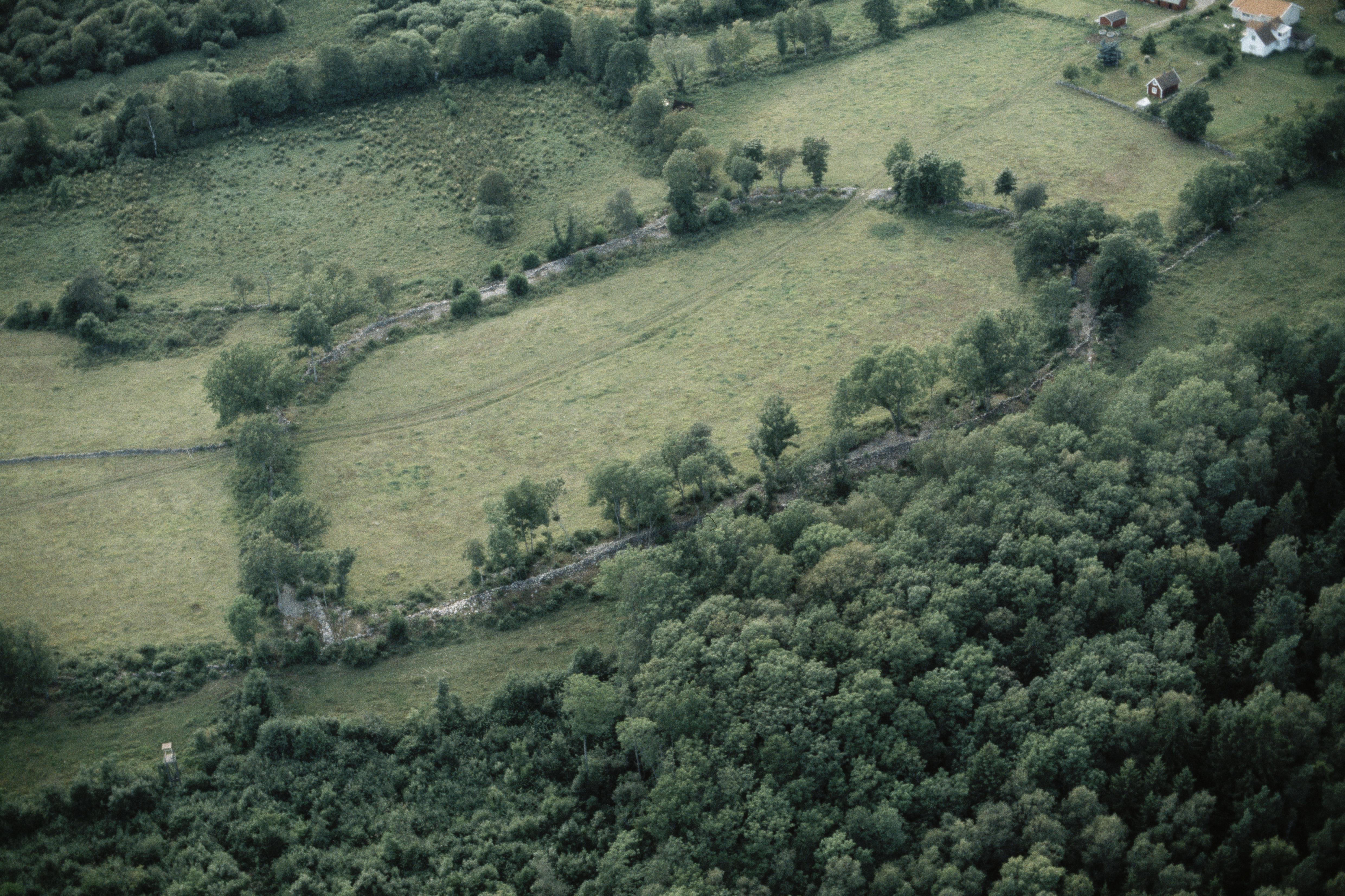 Beskrivning: Området vid Vedby. Fornborg RAÄnr Högby 23:1 vid bildens mitt. Bilden är tagen mot (väderstreck): NV