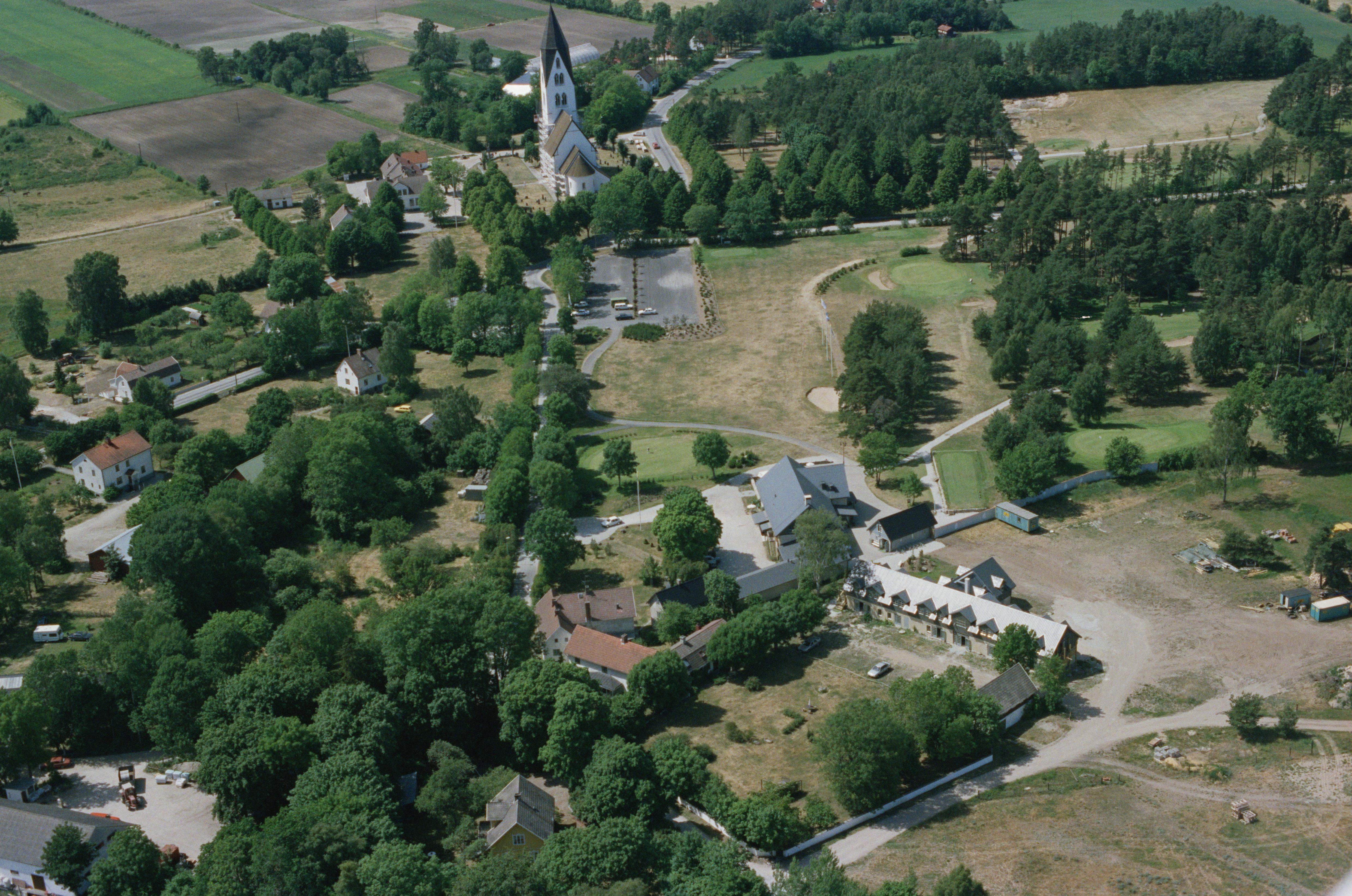 Beskrivning: Gumbalde golf och hotel vid Stånga kyrkby. I golfbanan boplats RAÄnr Stånga 55:4 m.fl. Stånga kyrka till vänster i bildens övre del. Bilden är tagen mot (väderstreck): VNV