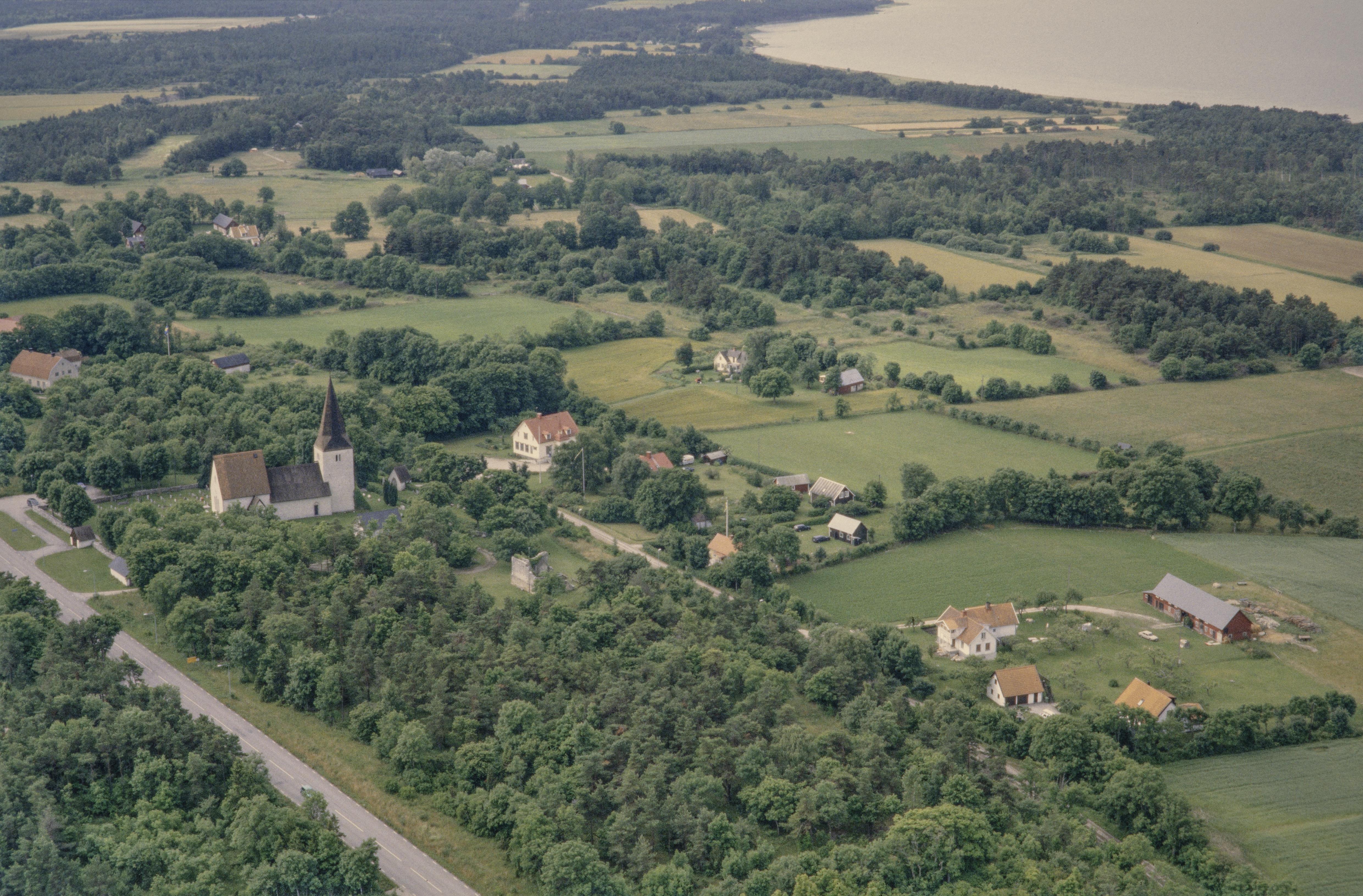 Beskrivning: Fröjels kyrka och kyrkby nere till vänster. Vid kyrkan kastal (ruin) RAÄnr Fröjel 11:1. Bilden är tagen mot (väderstreck): SV