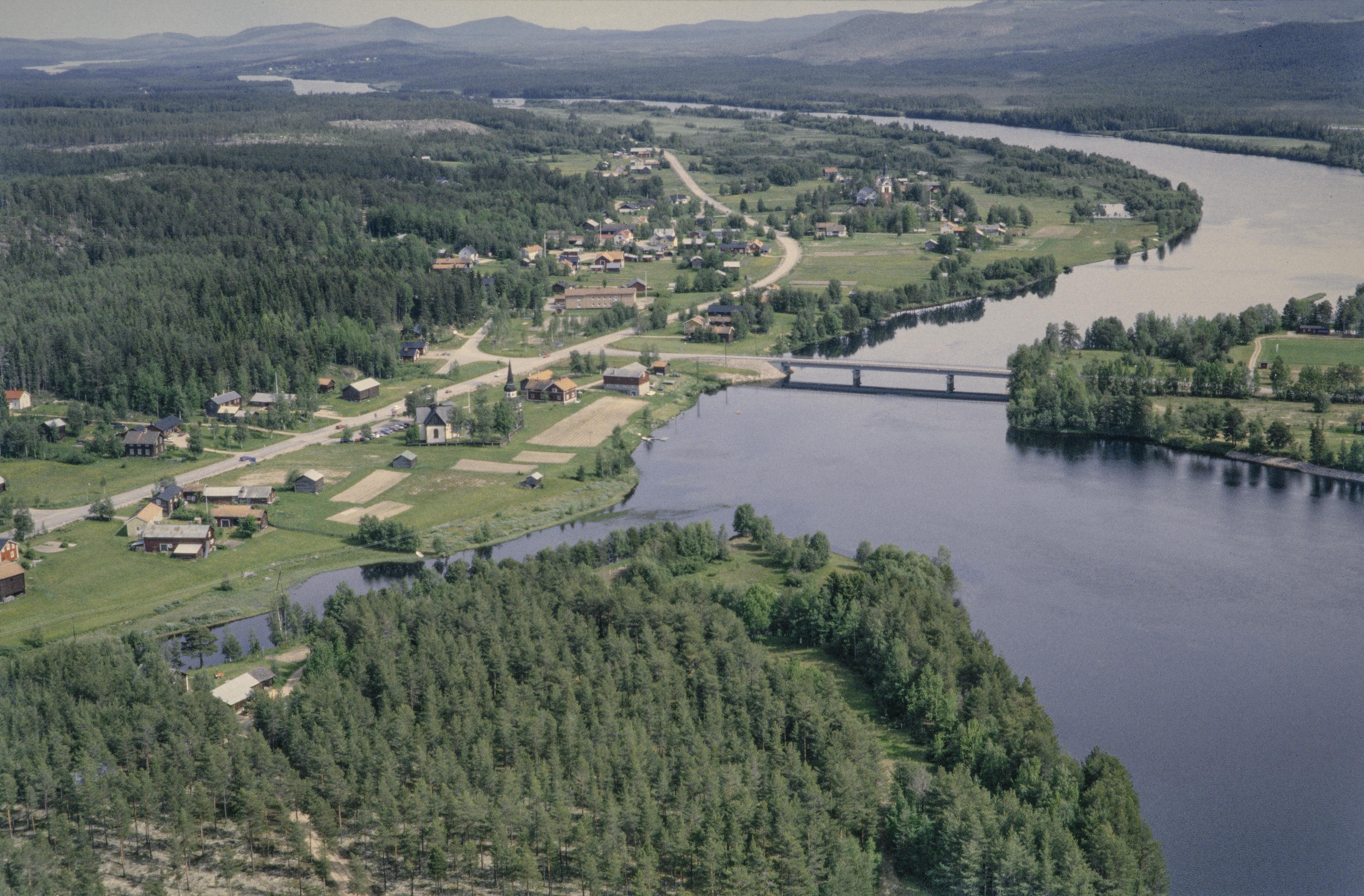 Beskrivning: Älven Ljusnan vid Älvros kyrkby. Norrälvens utlopp nere till vänster. Älvros gamla kyrka till vänster om bildens mitt, Älvros nya kyrka (Älvros kyrka) till höger över bildens mitt. I byn bytomt RAÄnr Älvros 464, 483, 465, 474, 484, 545 m.fl. Bilden är tagen mot (väderstreck): Ö