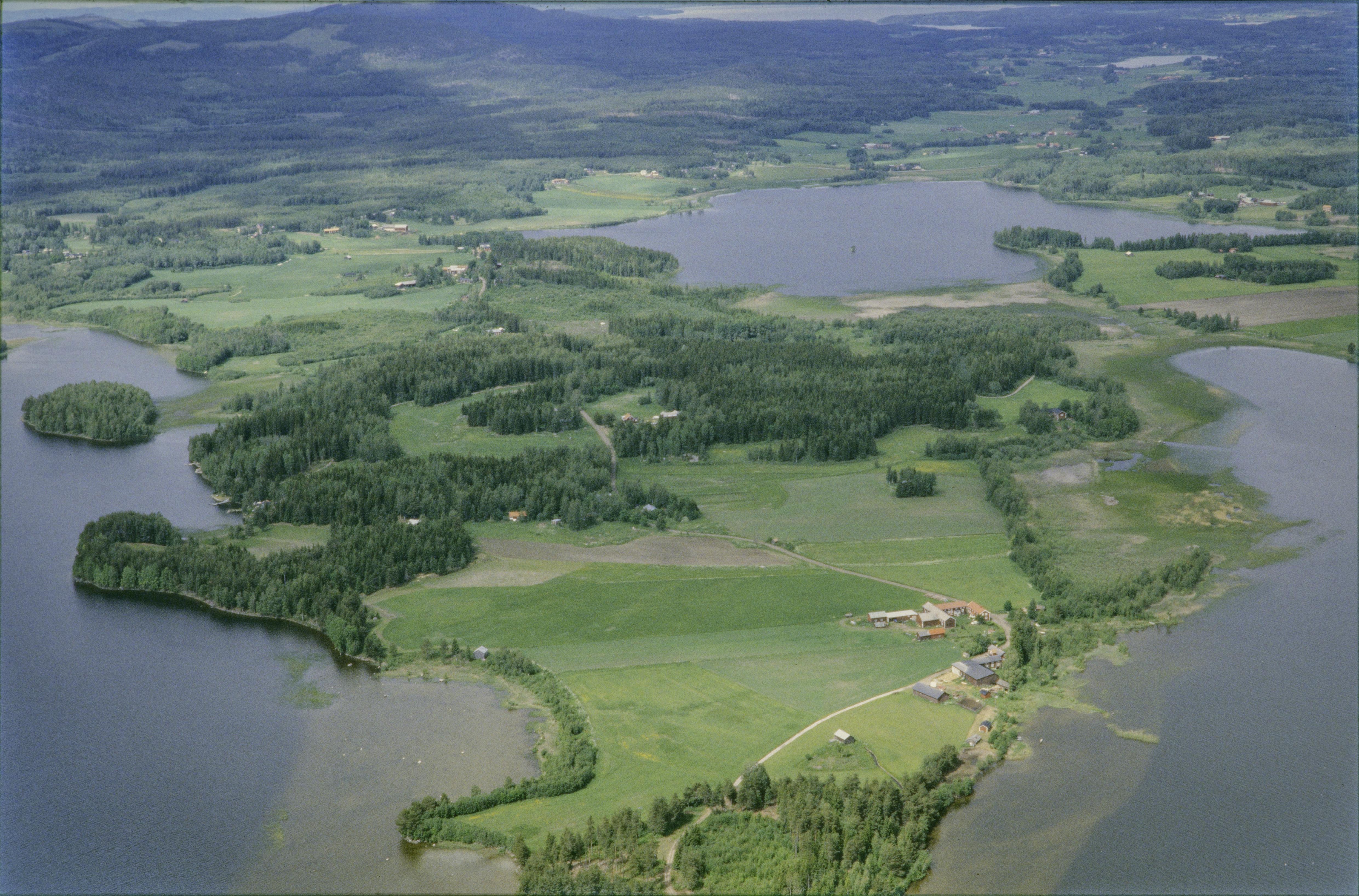 Beskrivning: Näset mellan Storsjön (till vänster) och Långsjön. Vid bildens mitt gravfält RAÄnr Forsa 179:1 och fossil åker Forsa 764. Mikje by över bildens mitt. Storön till höger över bildens mitt. Bilden är tagen mot (väderstreck): VNV